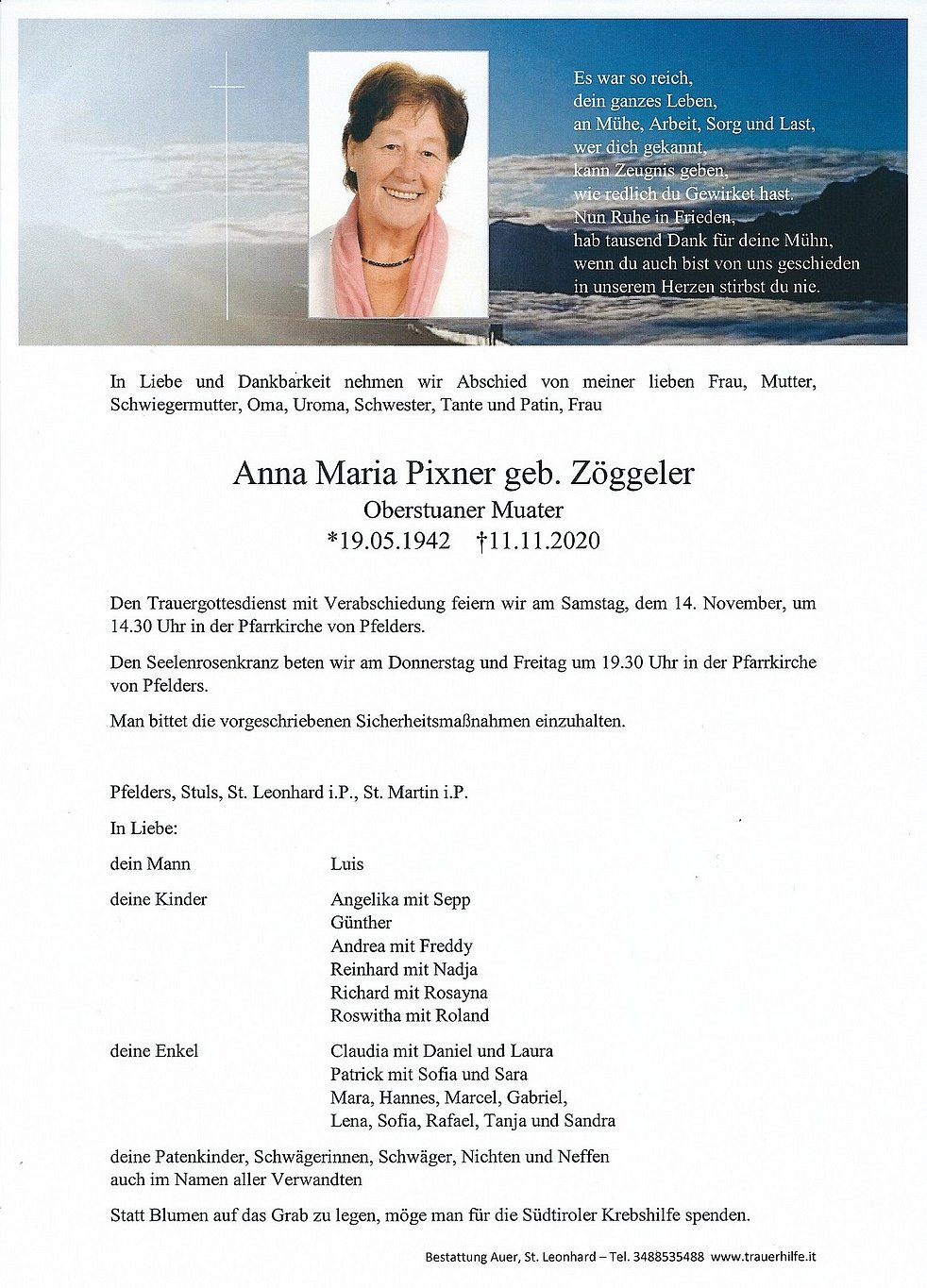 Den Trauergottesdienst mit Verabschiedung feiern wir am Samstag, dem 14. November, um 14.30 Uhr in der Pfarrkirche von Pfelders.