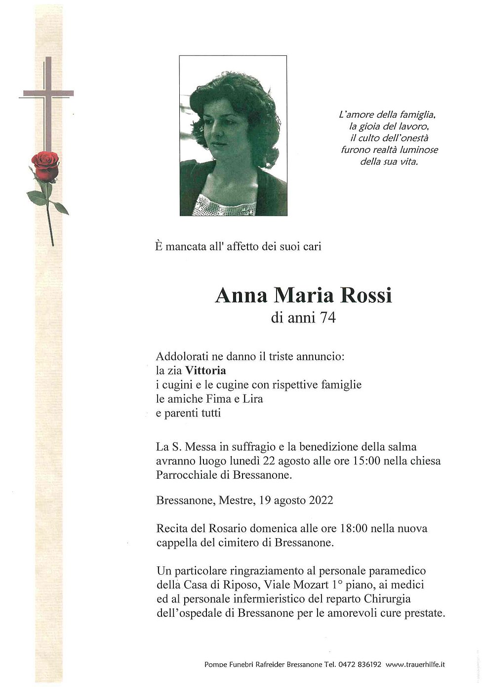 Un particolare ringraziamento al personale paramedico della Casa di Riposo, Viale Mozart 1° piano, ai medici ed al personale infermieristico del reparto Chirurgia dell’ospedale di Bressanone per le amorevoli cure prestate.