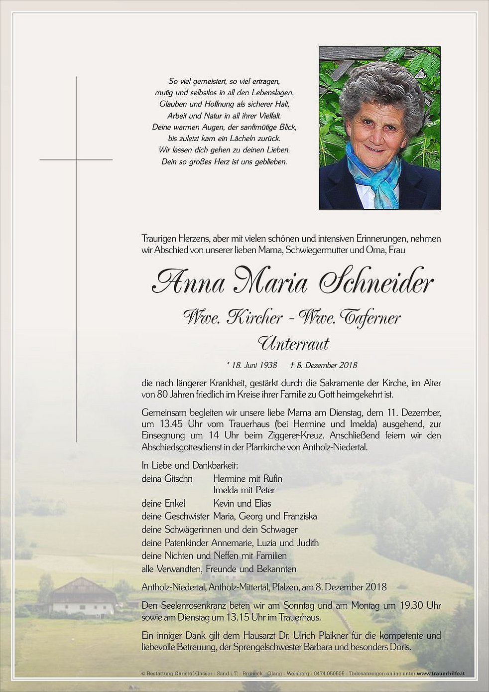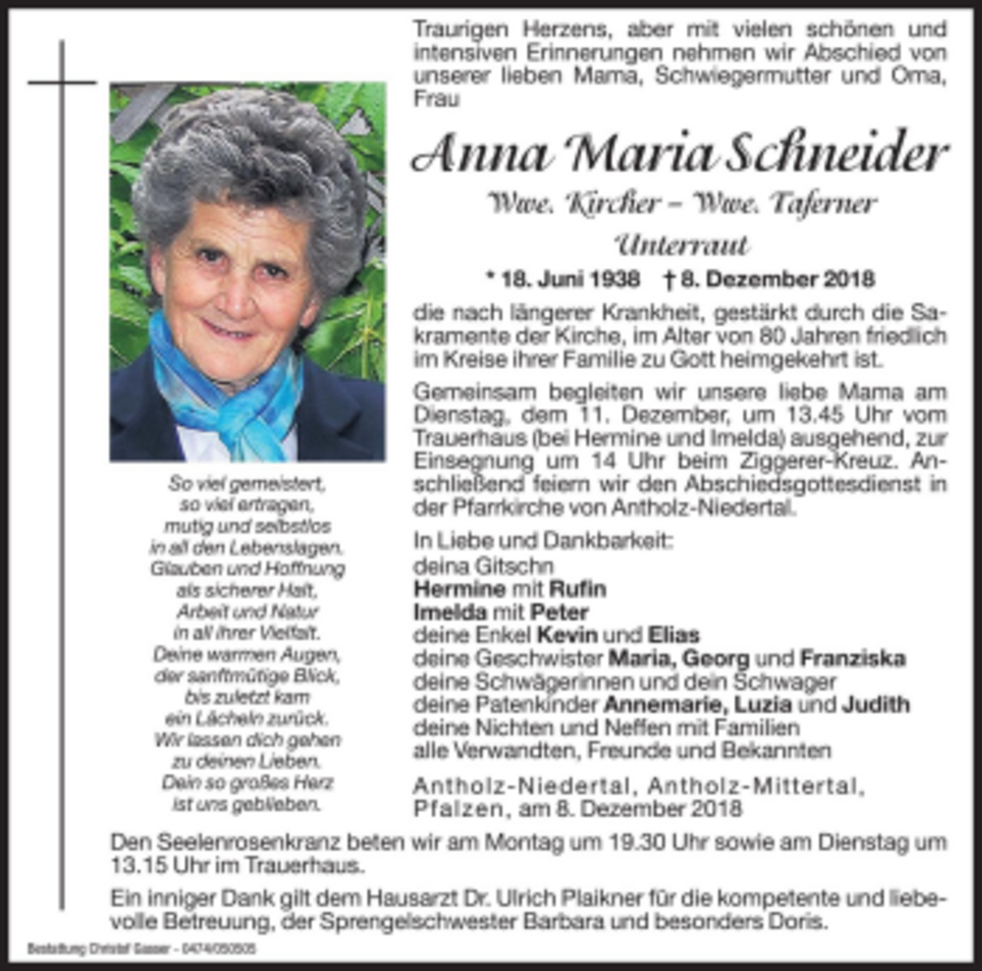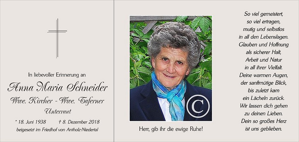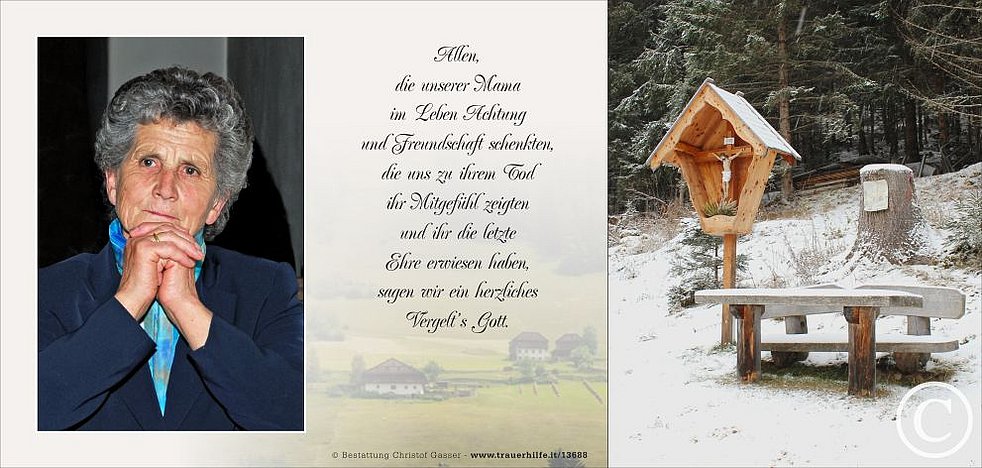 Gemeinsam begleiten wir unsere liebe Mama am Dienstag, dem 11. Dezember, um 13.45 Uhr vom Trauerhaus (bei Hermine und Imelda) ausgehend, zur Einsegnung um 14 Uhr beim Ziggerer-Kreuz. Anschließend feiern wir den Abschiedsgottesdienst in der Pfarrkirche von Antholz-Niedertal.