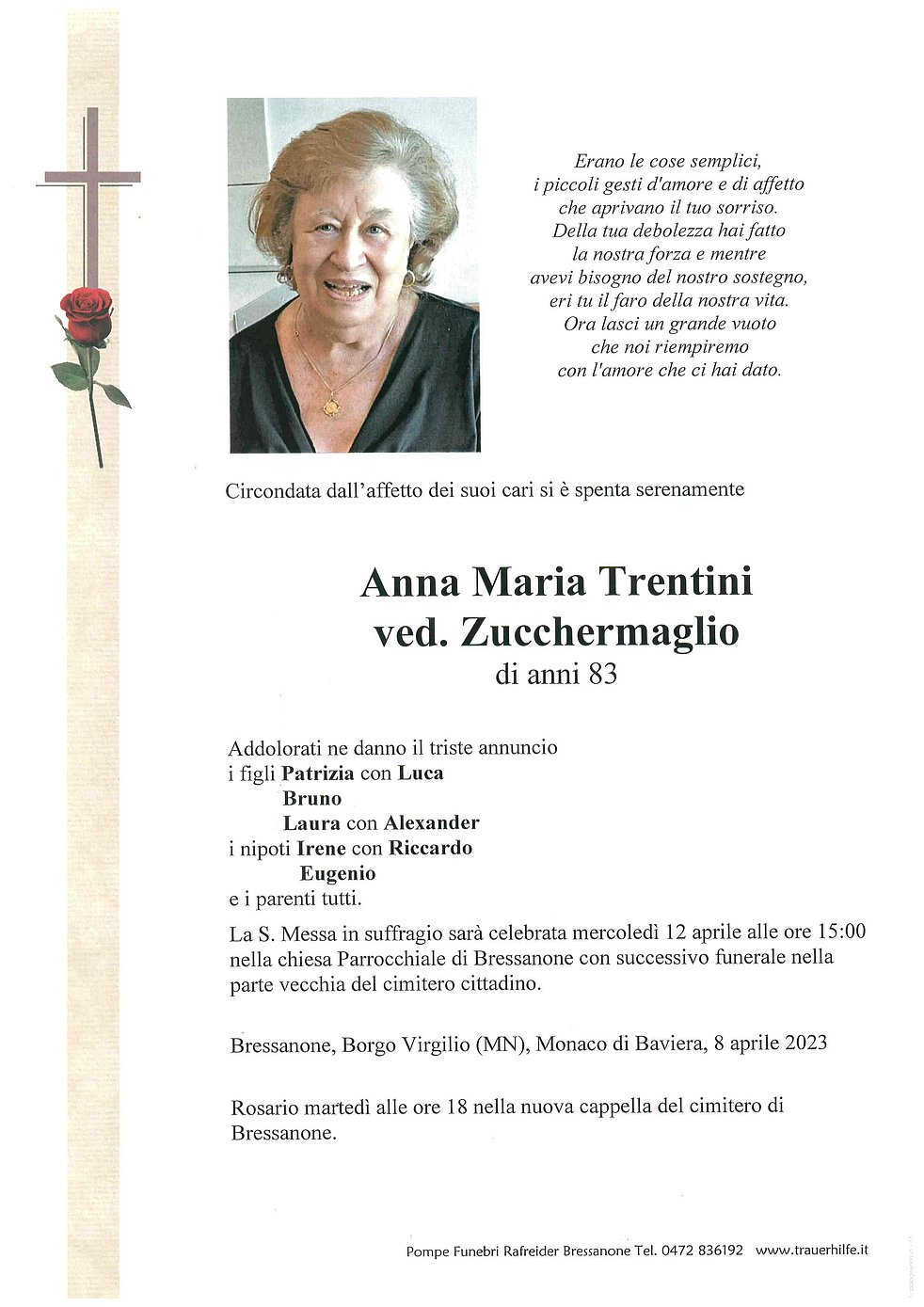 La S. Messa in suffragio sarà celebrata mercoledì 12 aprile alle ore 15:00 nella chiesa Parrocchiale di Bressanone con successivo funerale nella parte vecchia del cimitero cittadino.