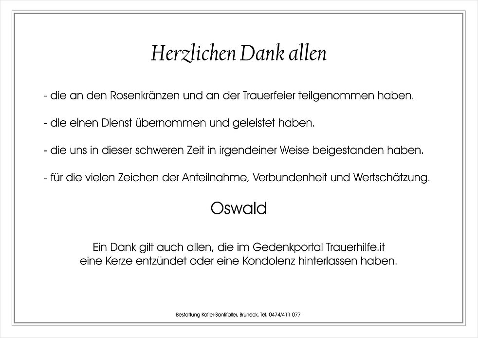 Es ist schwer bei einen solchen Anlass tröstende Worte zu finden,aber ich möchte dir meine herzliche Anteilnahme aussprechen und dir Oswald viel Kraft und Zuversicht wünschen.