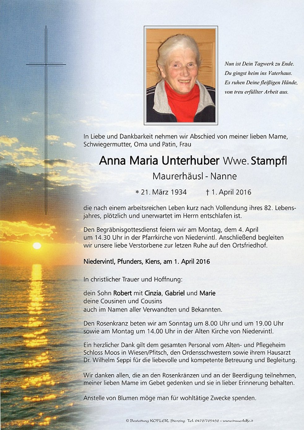 Den Begräbnisgottesdienst feiern wir am Montag, dem 4. April um 14.30 Uhr in der Pfarrkirche von Niedervintl. Anschließend begleiten wir unsere liebe Verstorbene zur letzen Ruhe auf den Ortsfriedhof.