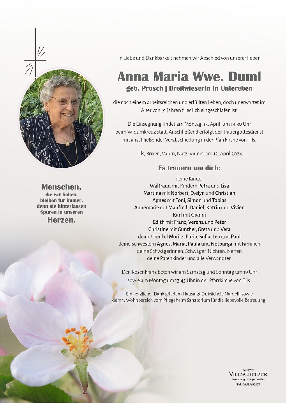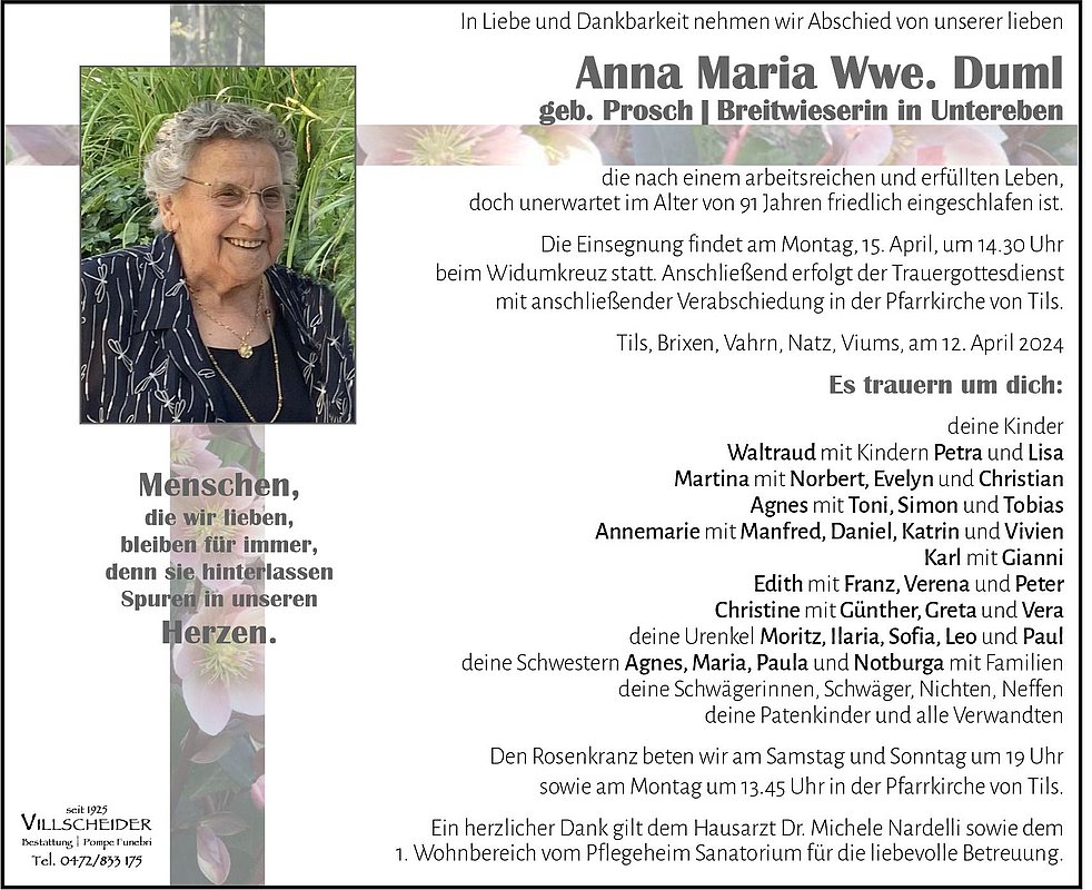 Alle Heimbewohner und MitarbeiterInnen des Sanatoriums in Brixen wünschen Euch viel Kraft, Zuversicht und Gottvertrauen in dieser schweren Zeit des Abschieds. Eure Mama wird uns mit ihrer positiven und lebensfrohen Art immer in Erinnerung bleiben.