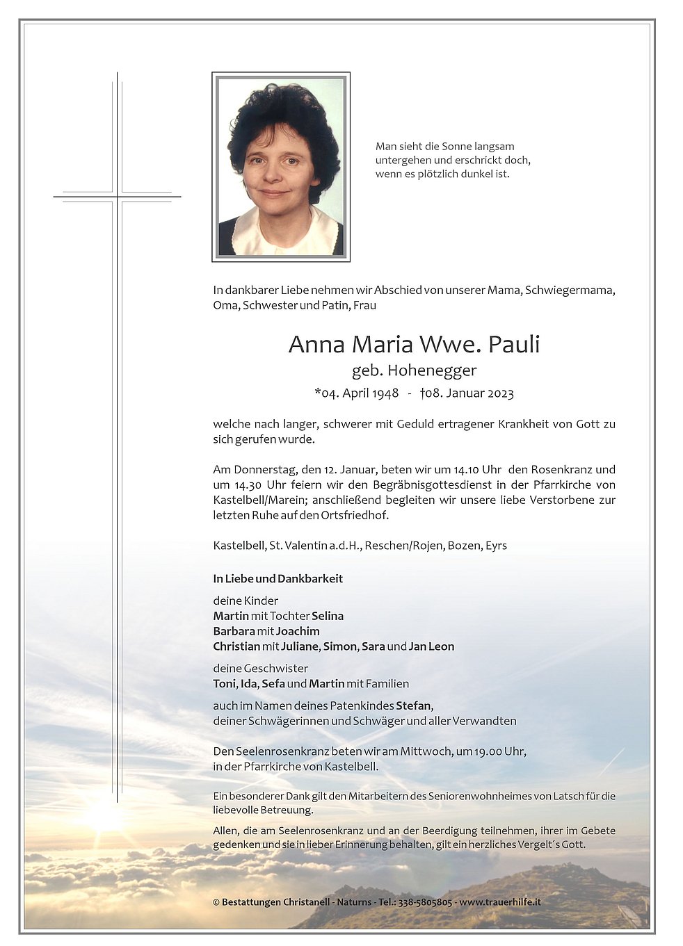 Am Donnerstag, den 12. Januar, beten wir um 14.10 Uhr den Rosenkranz und um 14.30 Uhr feiern wir den Begräbnisgottesdienst in der Pfarrkirche von Kastelbell/Marein; anschließend begleiten wir unsere liebe Verstorbene zur letzten Ruhe auf den Ortsfriedhof.