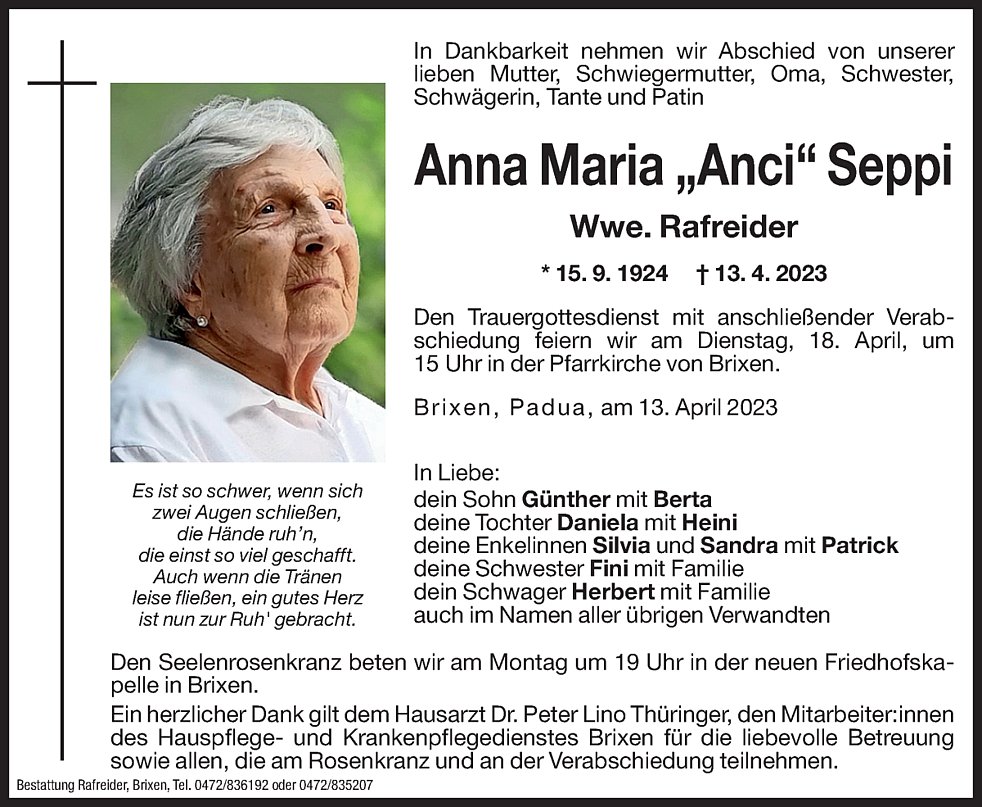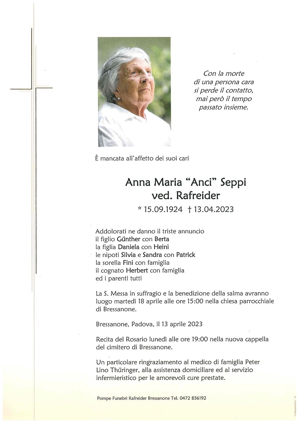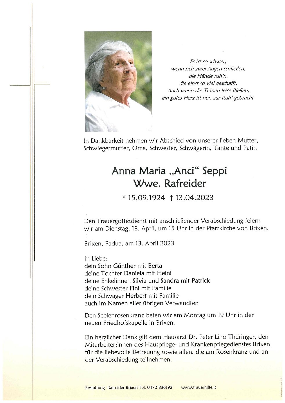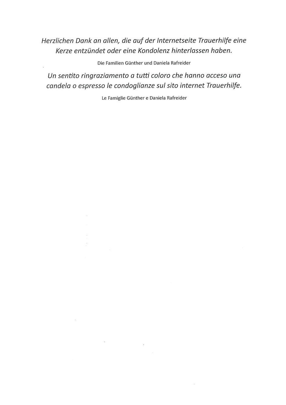 Liebe Fam. Rafreider, wir möchten Euch unser aufrichtig empfundenes Beileid aussprechen. In diesen schmerzvollen Stunden sind wir in Gedanken bei Euch.