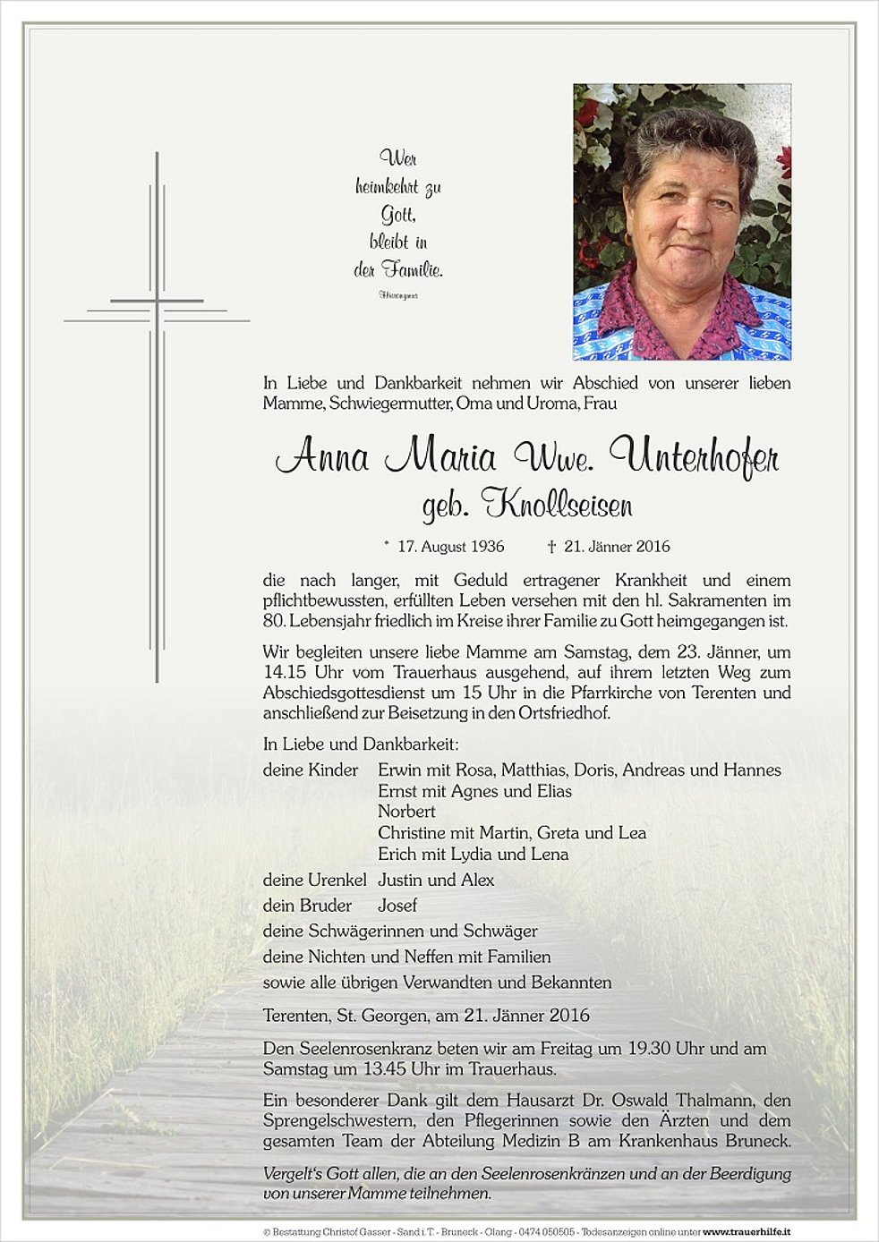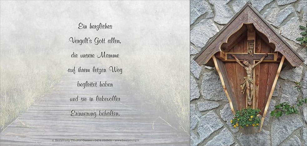 Wir begleiten unsere liebe Mamme am Samstag, dem 23. Jänner, um 14.15 Uhr vom Trauerhaus ausgehend, auf ihrem letzten Weg zum Abschiedsgottesdienst um 15 Uhr in die Pfarrkirche von Terenten und anschließend zur Beisetzung in den Ortsfriedhof.