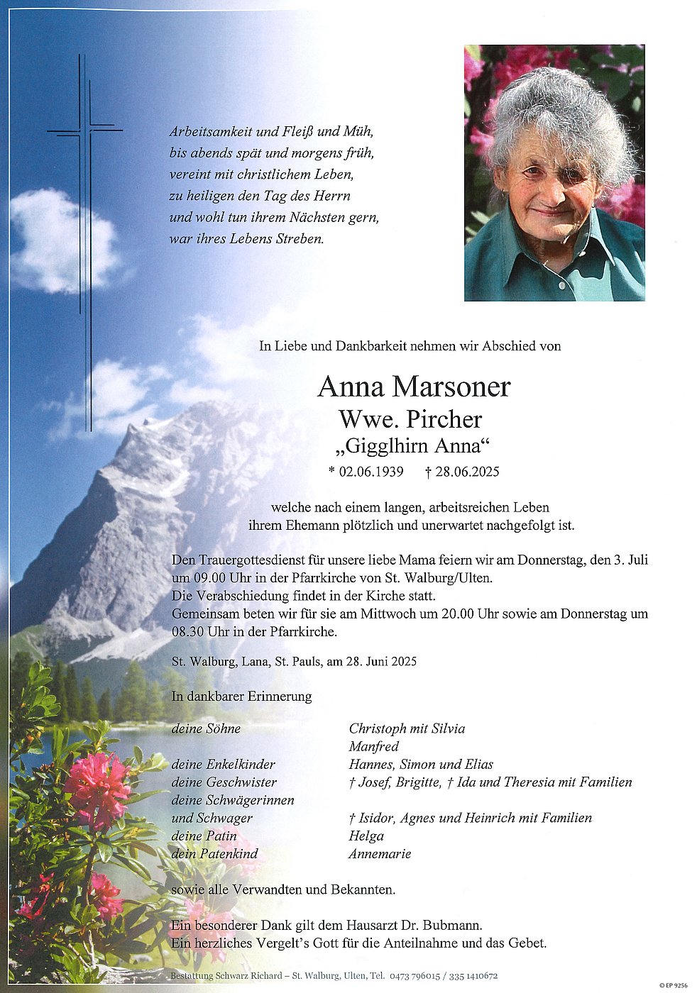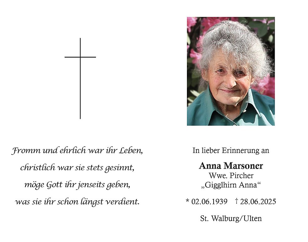 Den Trauergottesdienst für unsere liebe Mama feiern wir am Donnerstag, den 3. Juli um 09.00 Uhr in der Pfarrkirche von St. Walburg/Ulten.