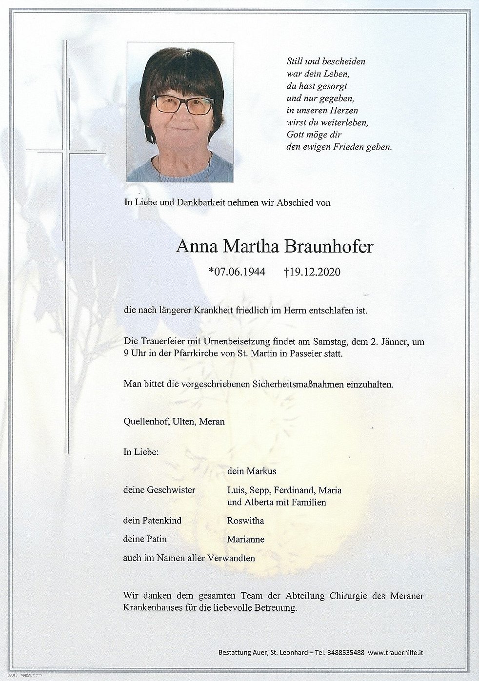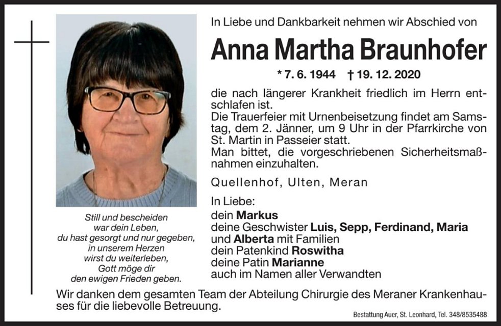Die Trauerfeier mit Urnenbeisetzung findet am Samstag, dem 2. Jänner, um 9 Uhr in der Pfarrkirche von St. Martin in Passeier statt.
