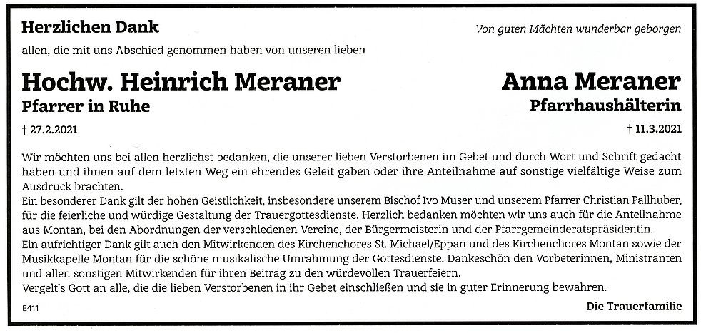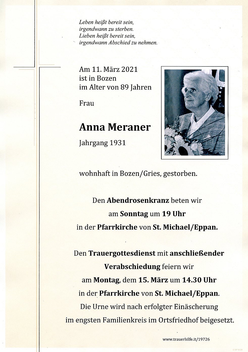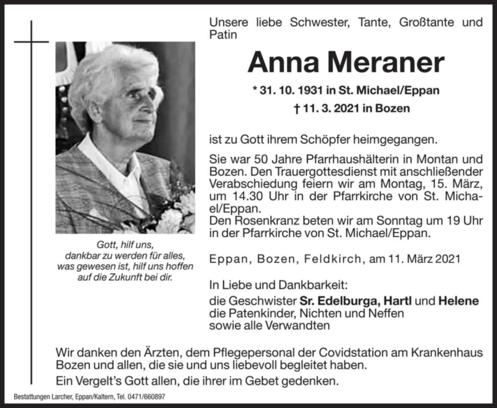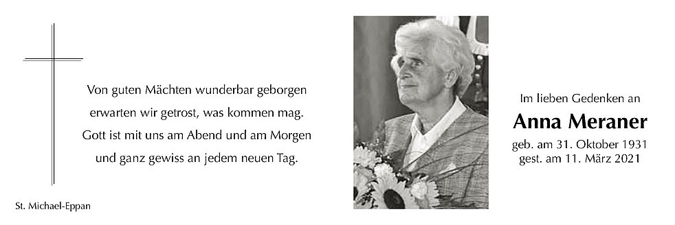 Den Trauergottesdienst mit anschließender Verabschiedung feiern wir am Montag, 15. März um 14.30 Uhr in der Pfarrkirche von St. Michael/Eppan.