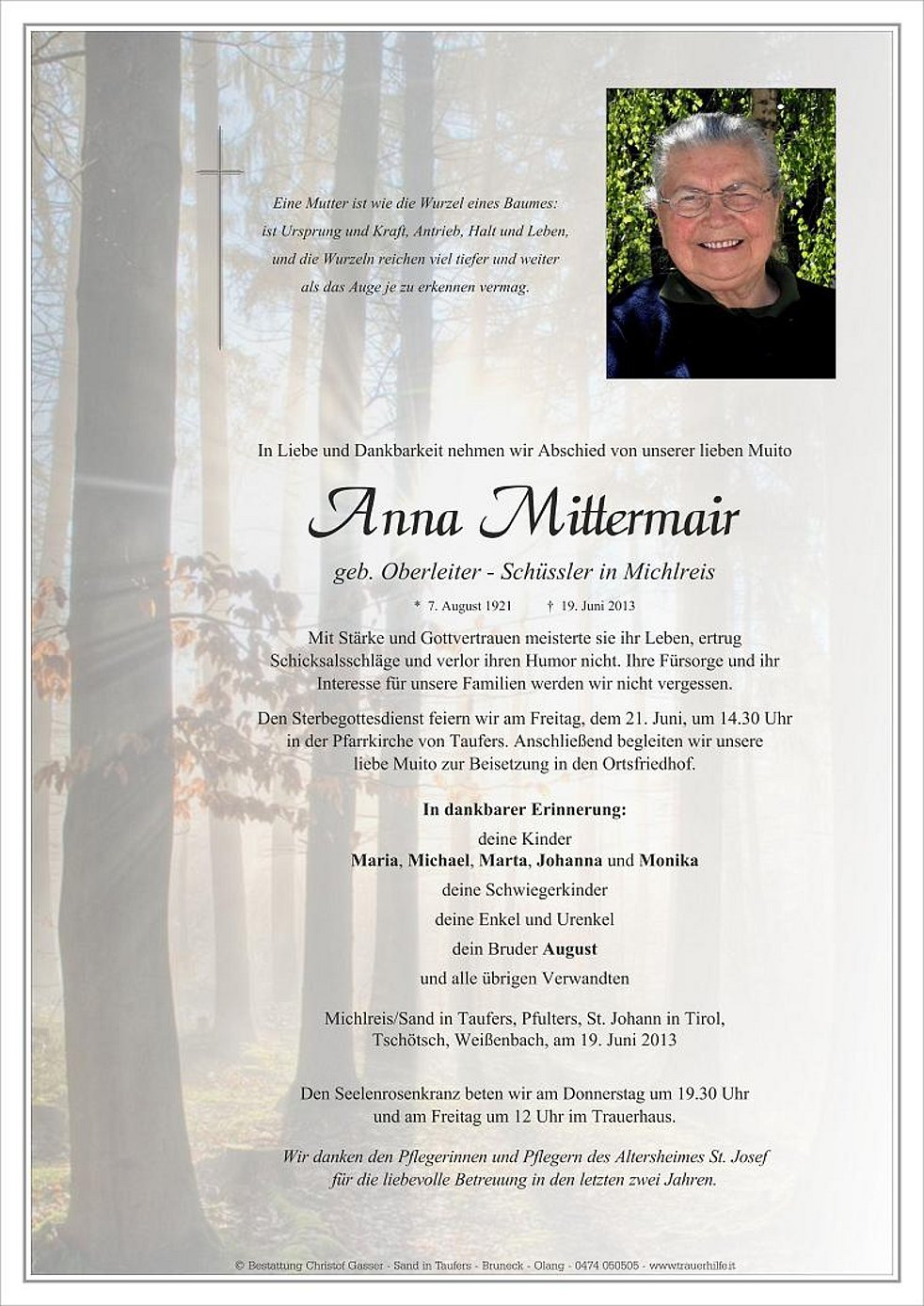 Den Sterbegottesdienst feiern wir am Freitag, dem 21. Juni, um 14.30 Uhr