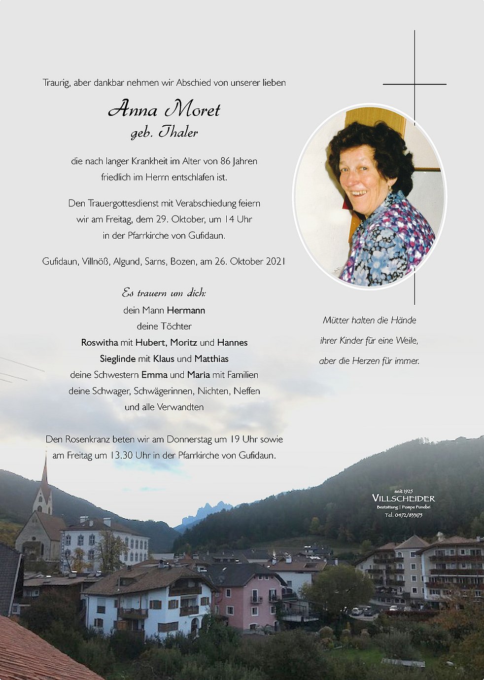 Wenn ma liabe Menschn gean lossn muass, isch des ollm mit Trauer, Schmerz und mit a groaßer inneren Leere verbundn. Die Zeit bleibt stean, Bilder der Erinnerung steign auf, mir nemmen Onteil an enkern Schmerz und winschn enk an guatn Zusommenholt af enkern Weg des Obschiednemmend, dass eis GOTTES Beistond erfohrn kennts durch Menschn, dia enk tröstend u helfend zur Seite stean und a bereit sein a Stickl van Weg mitzugean. Möge enkre guate Mama und Oma in ewign Friedn findn in der himmlischn Wohnung und möge sie wieder vereint sein mit oll den Seinen, dia ihm vorausgongen sein.