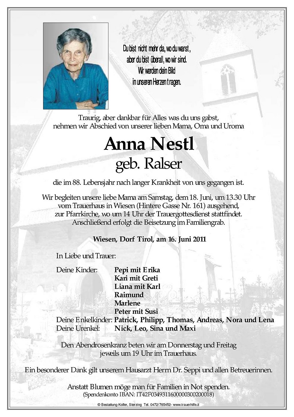 Wir begleiten unsere liebe Mama am Samstag, dem 18. Juni, um 13.30 Uhr vom
