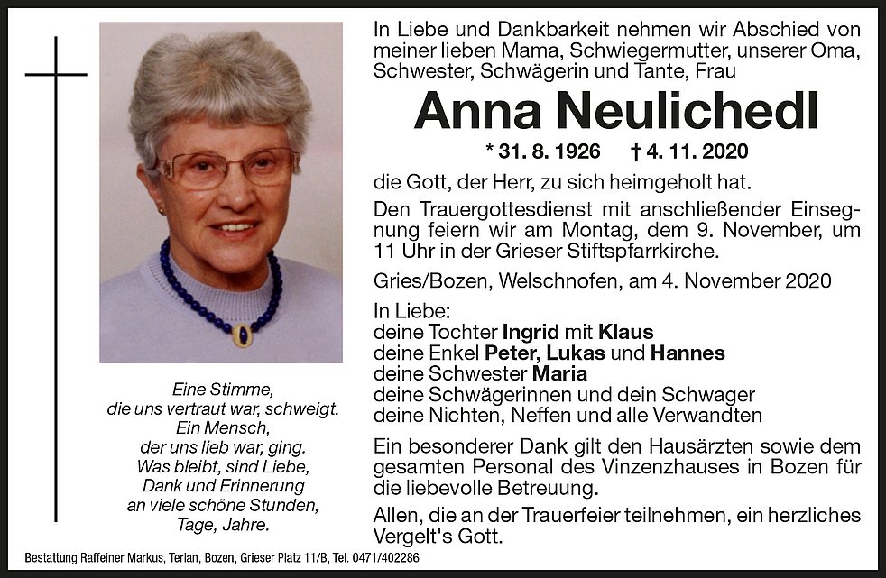 Den Trauergottesdienst mit anschließender Einsegnung feiern wir am Montag, dem 9. November, um 11 Uhr in der Grieser Stiftspfarrkirche.