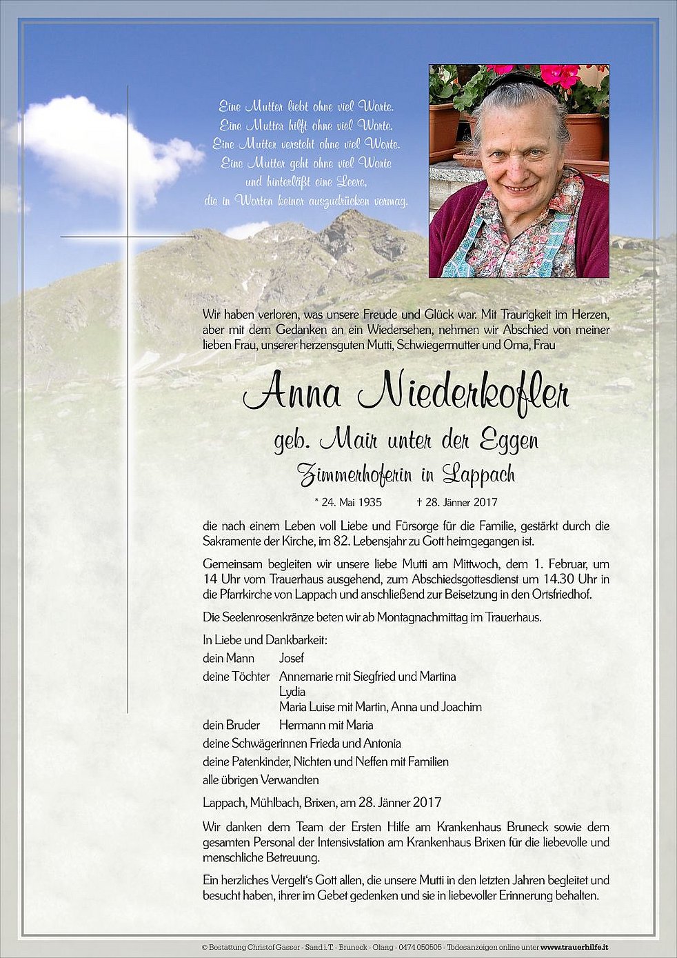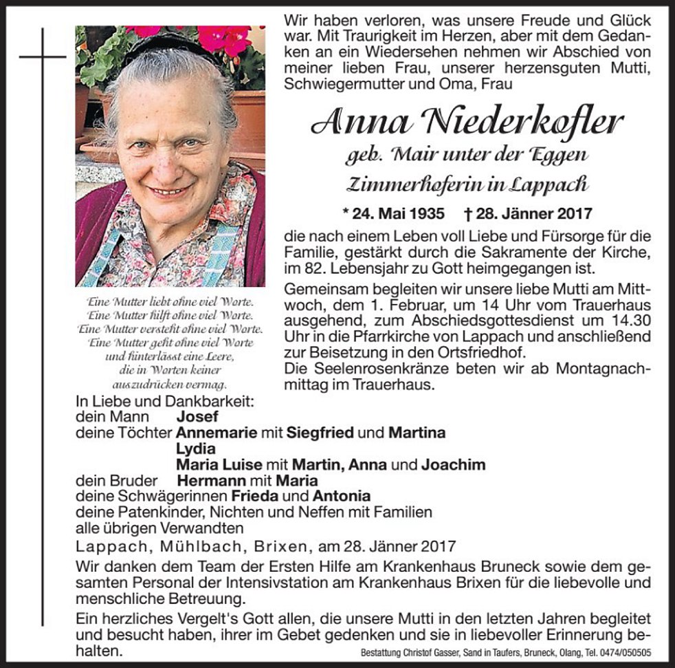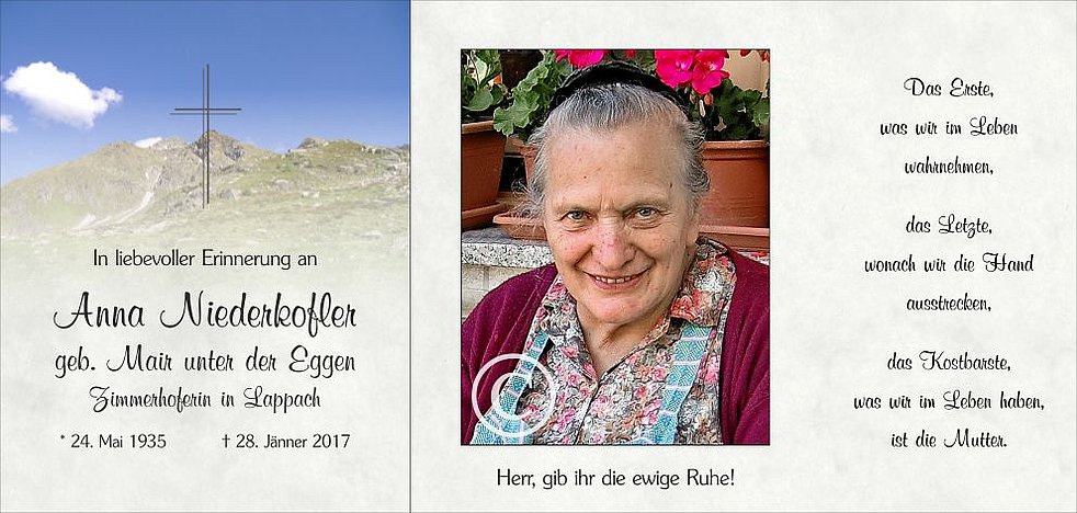 Gemeinsam begleiten wir unsere liebe Mutti am Mittwoch, dem 1. Februar, um 14 Uhr vom Trauerhaus ausgehend, zum Abschiedsgottesdienst um 14.30 Uhr in die Pfarrkirche von Lappach und anschließend zur Beisetzung in den Ortsfriedhof.