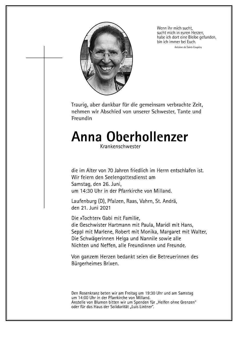 Liebe Anna, stets freundlich und guter Laune bist du mir begegnet, trotz deines schweren Schicksals. Möge dir nun Gott vergelten, was du auf Erden Gutes getan hast.