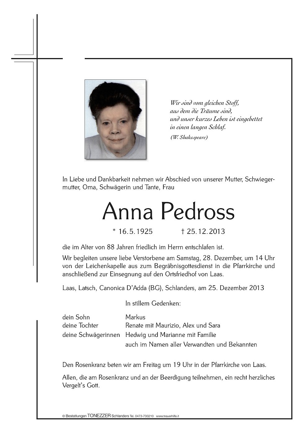 Wir begleiten unsere liebe Verstorbene am Samstag, 28. Dezember, um 14 Uhr von der Leichenkapelle aus zum Begräbnisgottesdienst in die Pfarrkirche und anschließend zur Einsegnung auf den Ortsfriedhof von Laas.