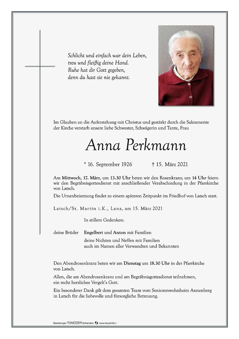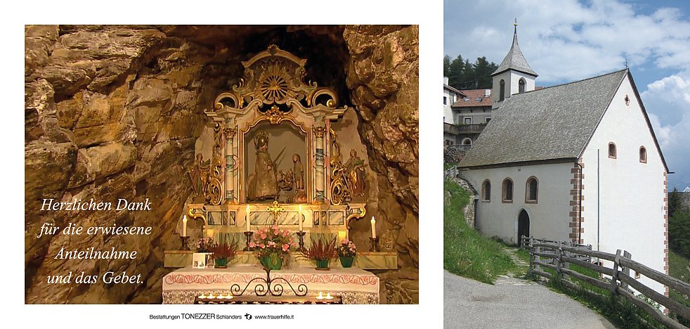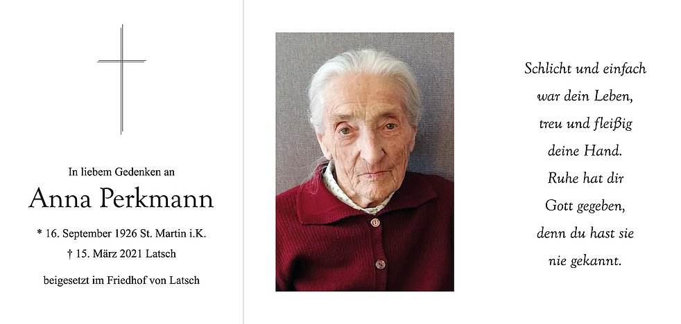 Am Mittwoch, 17. März, um 13.30 Uhr beten wir den Rosenkranz; um 14 Uhr feiern wir den Begräbnisgottesdienst mit anschließender Verabschiedung in der Pfarrkirche von Latsch.