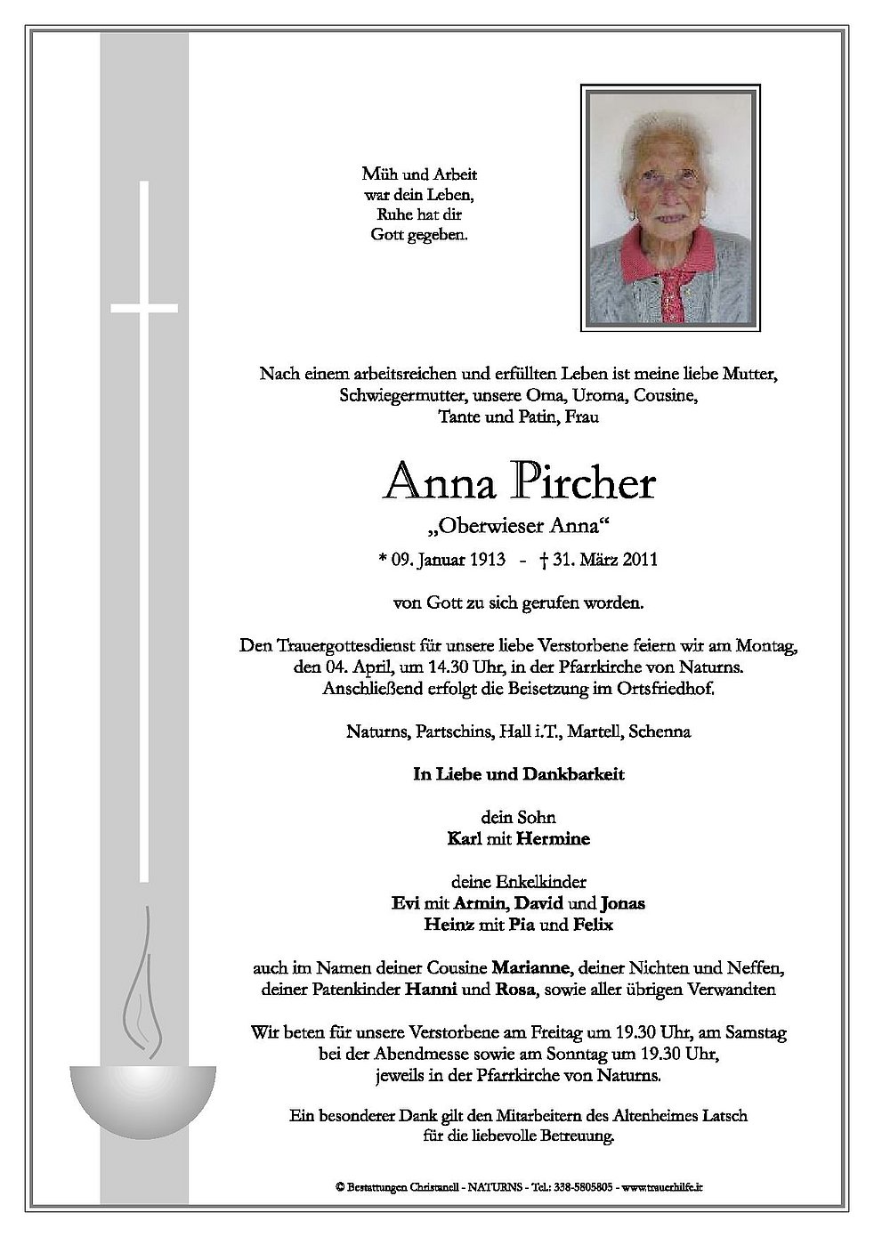 Den Trauergottesdienst für unsere liebe Verstorbene feiern wir am Montag, den 04. April, um 14.30 Uhr, in der Pfarrkirche von Naturns. Anschließend erfolgt die Beisetzung im Ortsfriedhof.