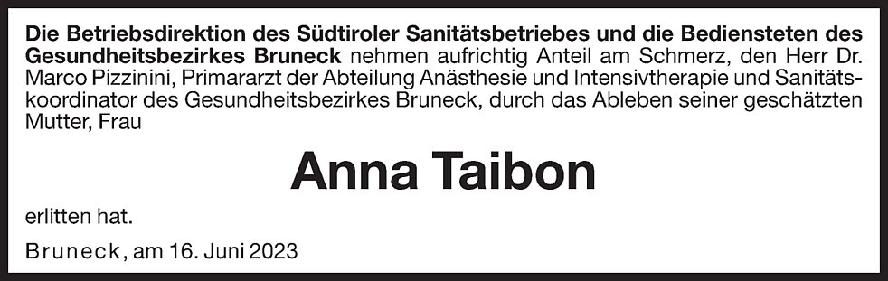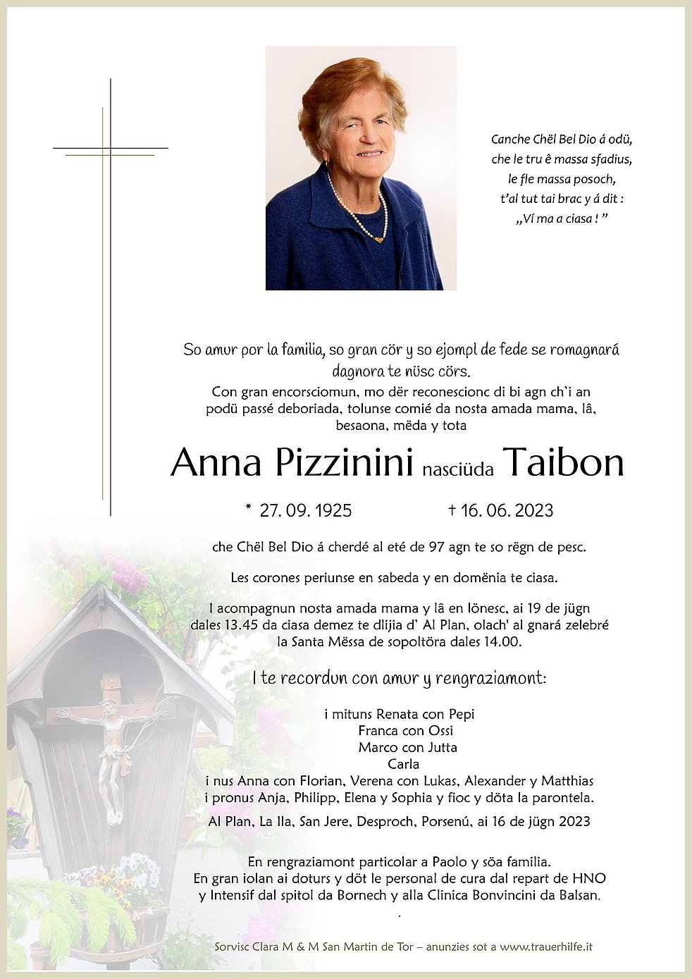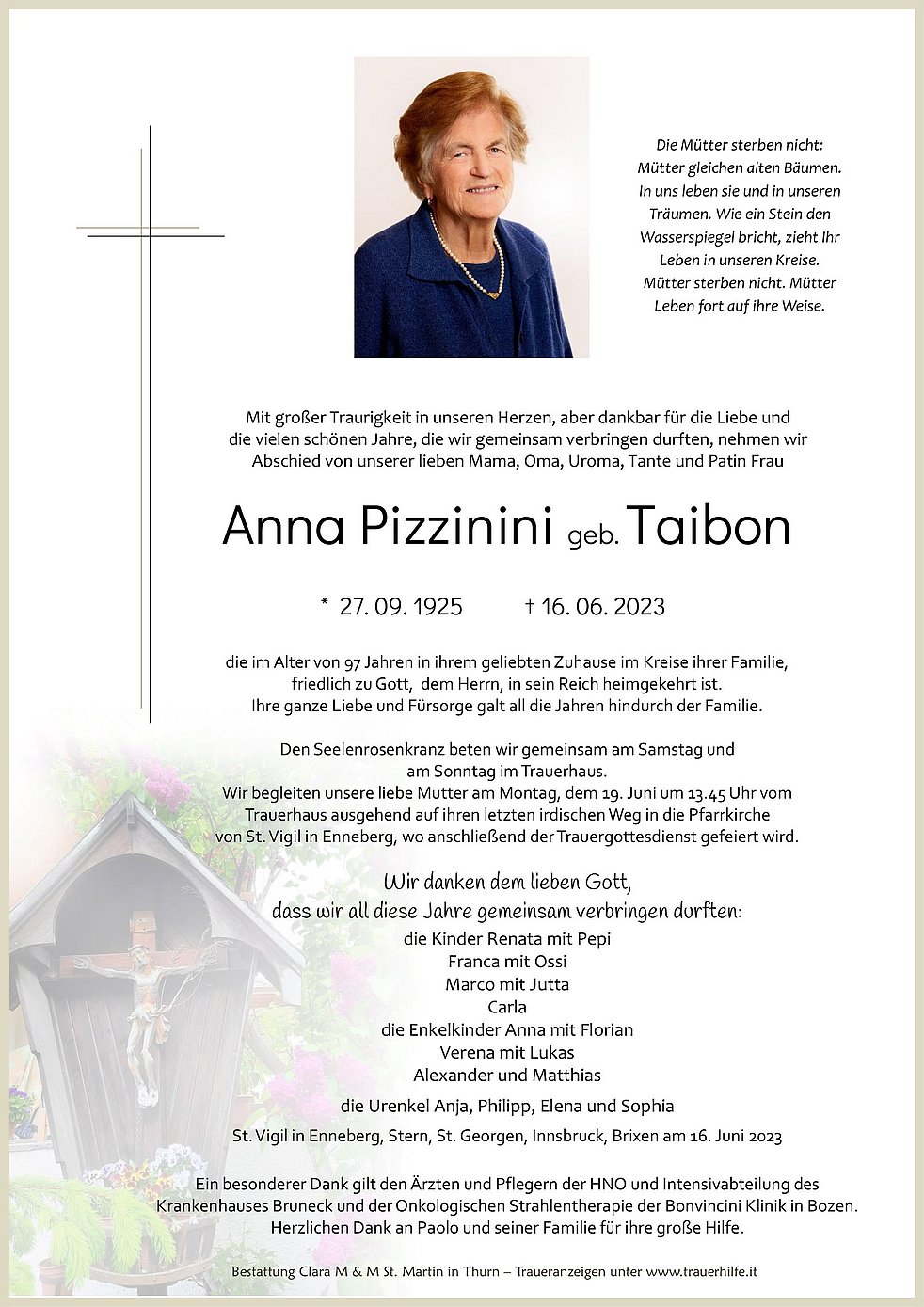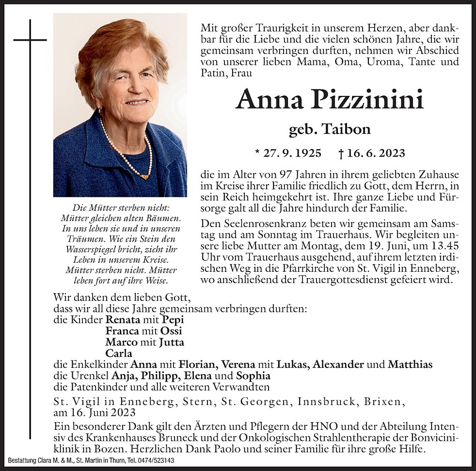 Wir begleiten unsere liebe Mutter am Montag, dem 19. Juni um 13.45 Uhr vom Trauerhaus ausgehend auf ihren letzten irdischen Weg in die Pfarrkirche von St. Vigil in Enneberg, wo anschließend der Trauergottesdienst gefeiert wird.