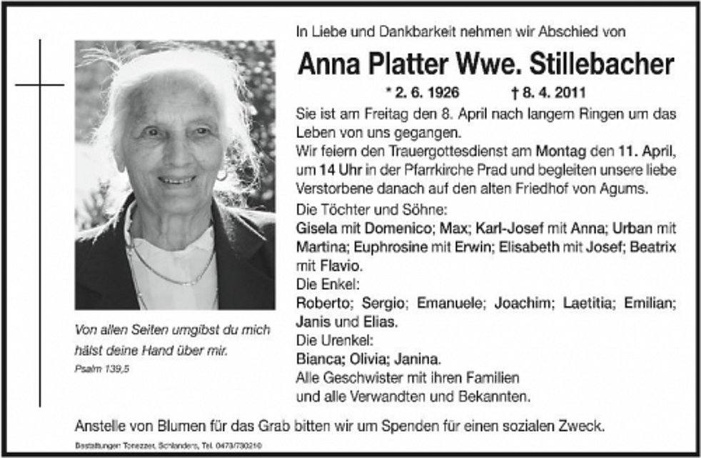 Wir feiern den Trauergottesdienst am Montag den 11. April, um 14 Uhr in der Pfarrkirche Prad und begleiten unsere liebe Verstorbene danach auf den alten Friedhof von Agums.