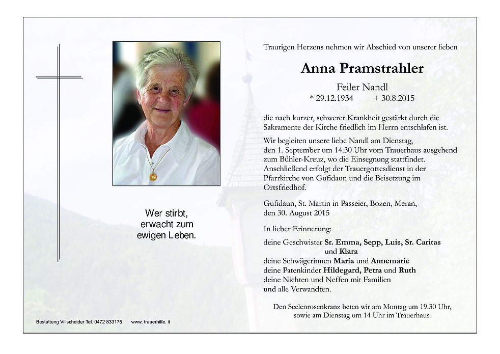 den 1. September um 14.30 Uhr vom Trauerhaus ausgehend zum Bühler-Kreuz, wo die Einsegnung stattfindet. Anschließend erfolgt der Trauergottesdienst in der Pfarrkirche von Gufidaun und die Beisetzung im Ortsfriedhof.