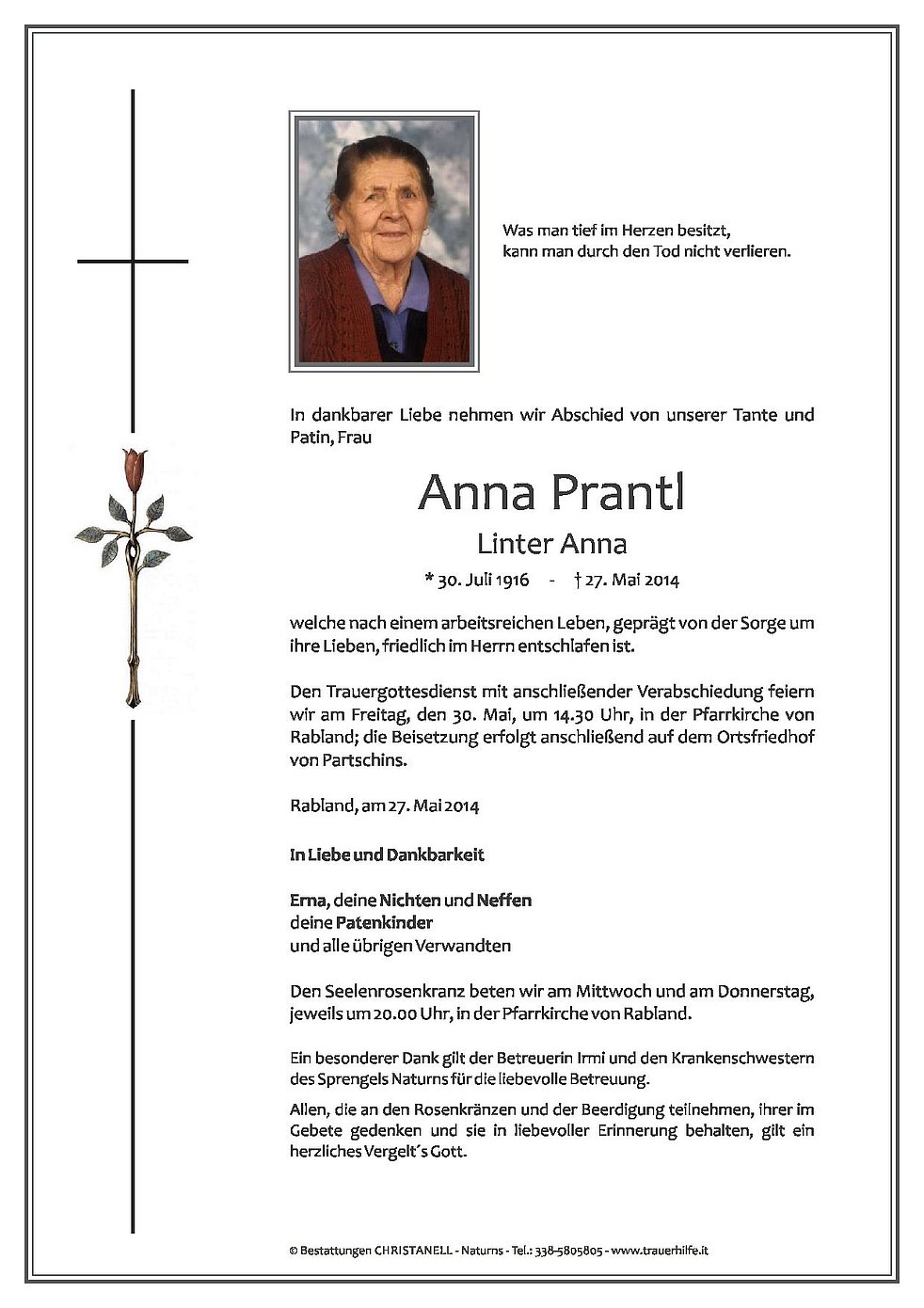 Den Trauergottesdienst mit anschließender Verabschiedung feiern wir am Freitag, den 30. Mai, um 14.30 Uhr, in der Pfarrkirche von Rabland; die Beisetzung erfolgt anschließend auf dem Ortsfriedhof von Partschins.