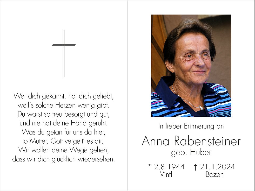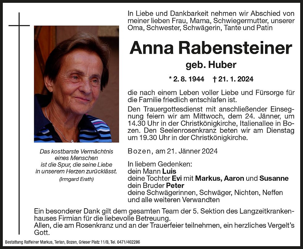 Den Trauergottesdienst mit anschließender Einsegnung feiern wir am Mittwoch, dem 24. Jänner, um 14.30 Uhr in der Christ-König-Kirche, Italienallee in Bozen.
