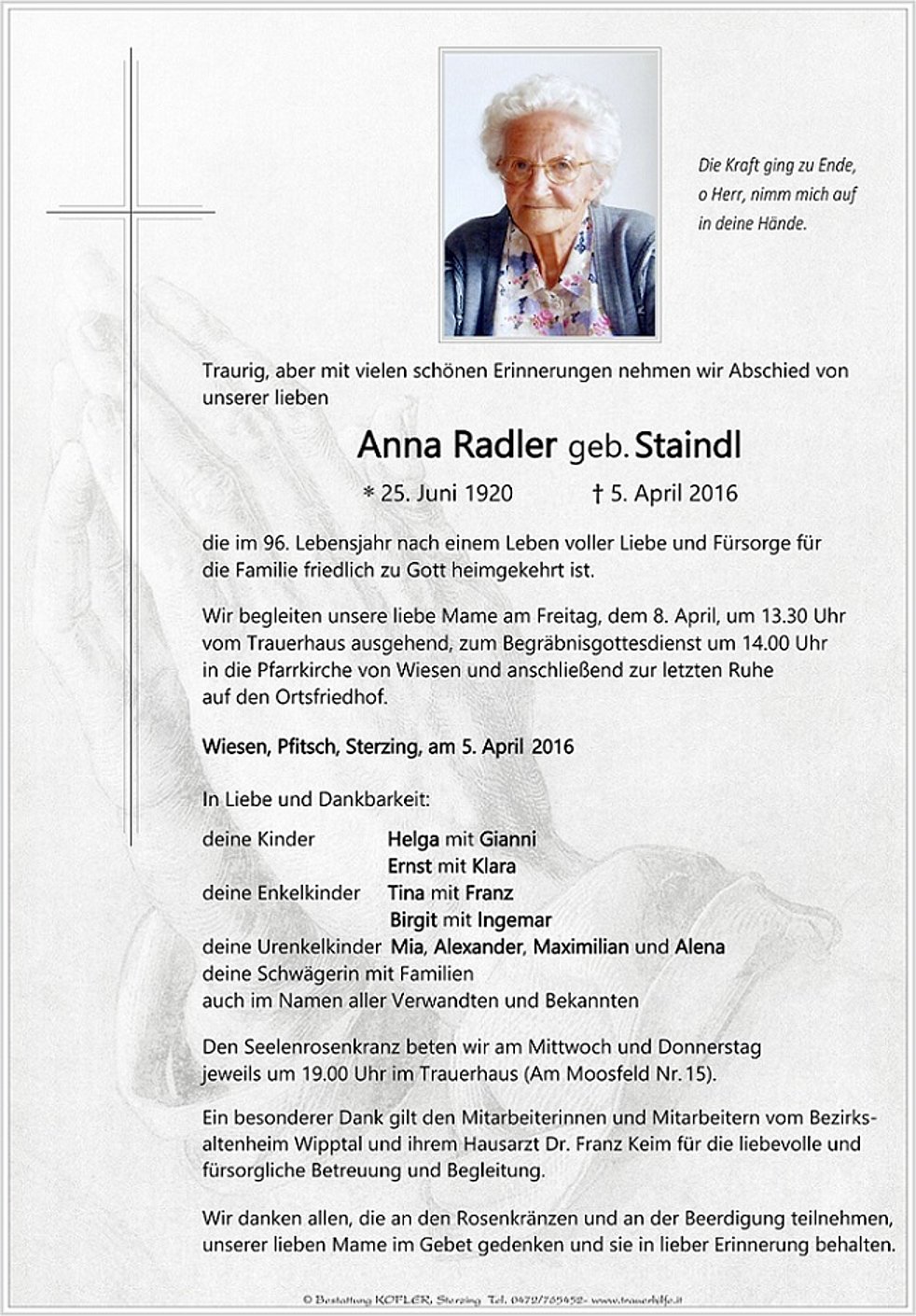 Ein besonderer Dank gilt den Mitarbeiterinnen und Mitarbeitern vom Bezirksaltenheim Wipptal und ihrem Hausarzt Dr. Franz Keim für die liebevolle und fürsorgliche Betreuung und Begleitung.