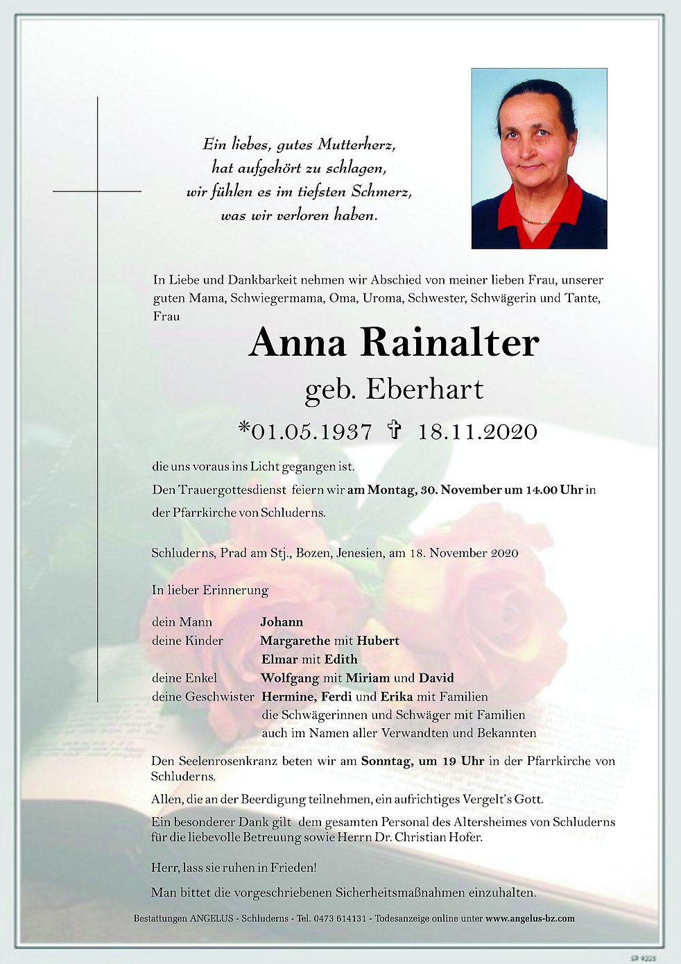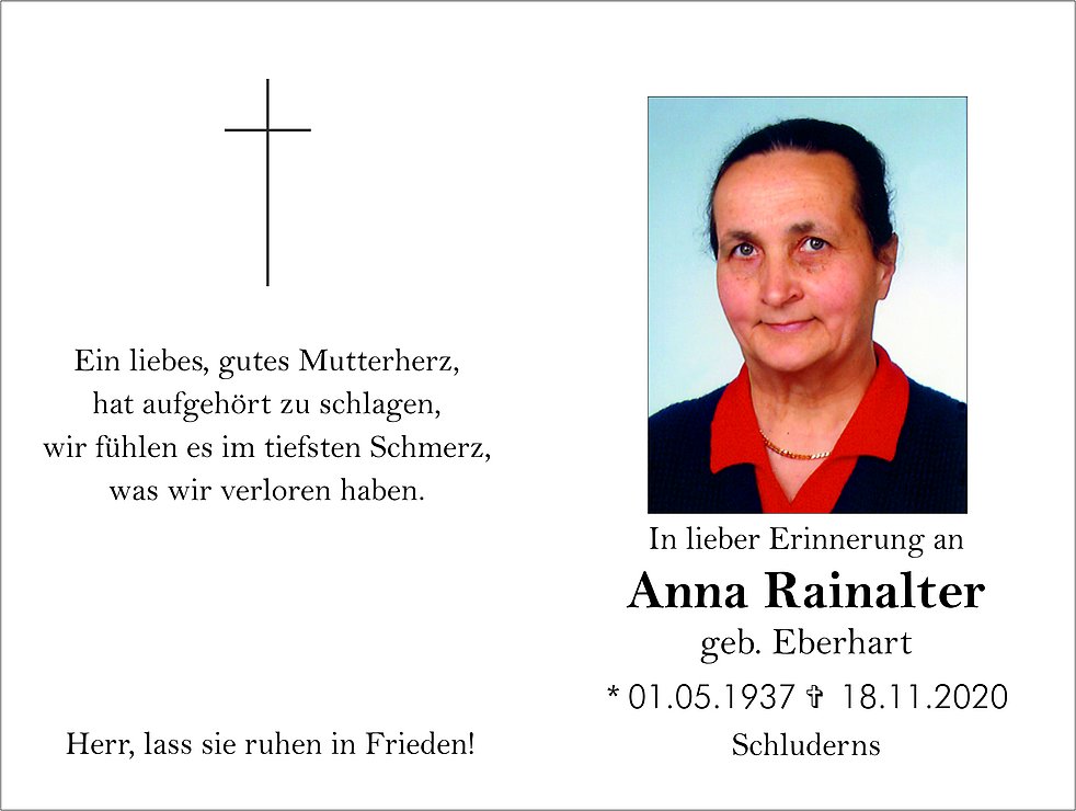 Den Trauergottesdienst feiern wir am Montag, 30. November um 14.00 Uhr in der Pfarrkirche von Schluderns.