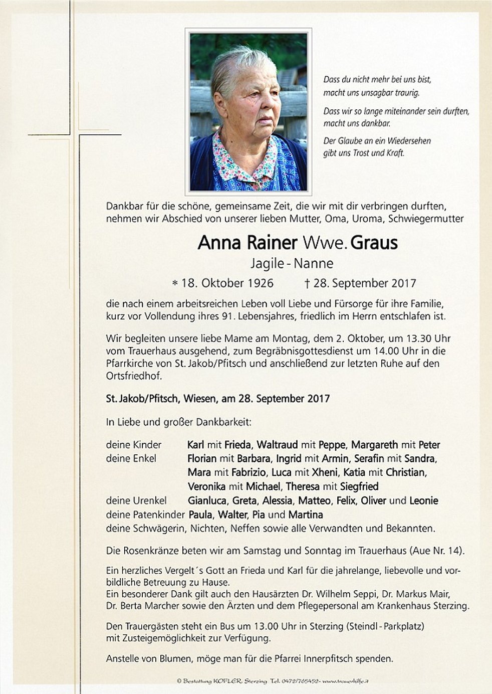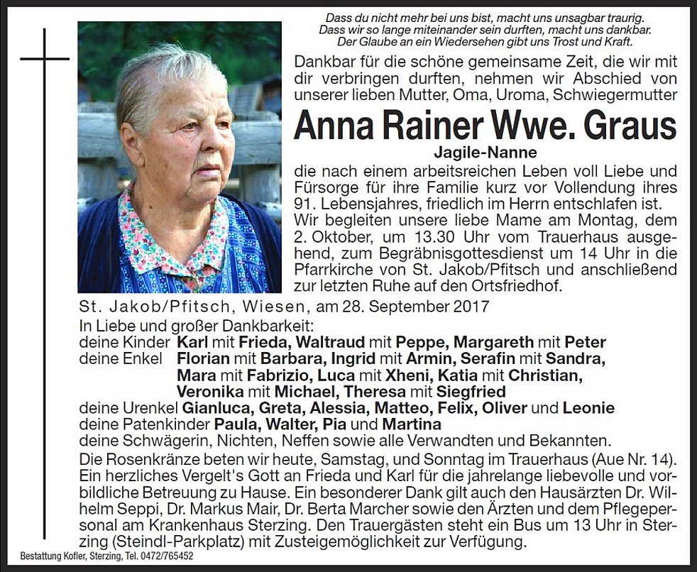 Wir begleiten unsere liebe Mame am Montag, dem 2. Oktober, um 13.30 Uhr vom Trauerhaus ausgehend, zum Begräbnisgottesdienst um 14.00 Uhr in die Pfarrkirche von St. Jakob/Pfitsch und anschließend zur letzten Ruhe auf den Ortsfriedhof.