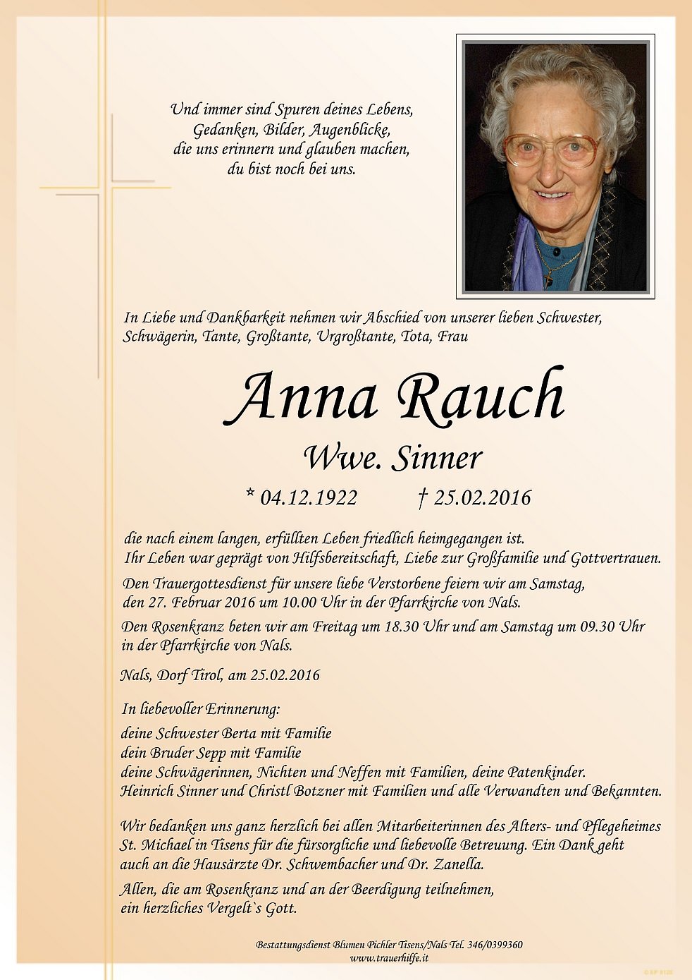 Den Trauergottesdienst für unsere liebe Verstorbene feiern wir am Samstag,