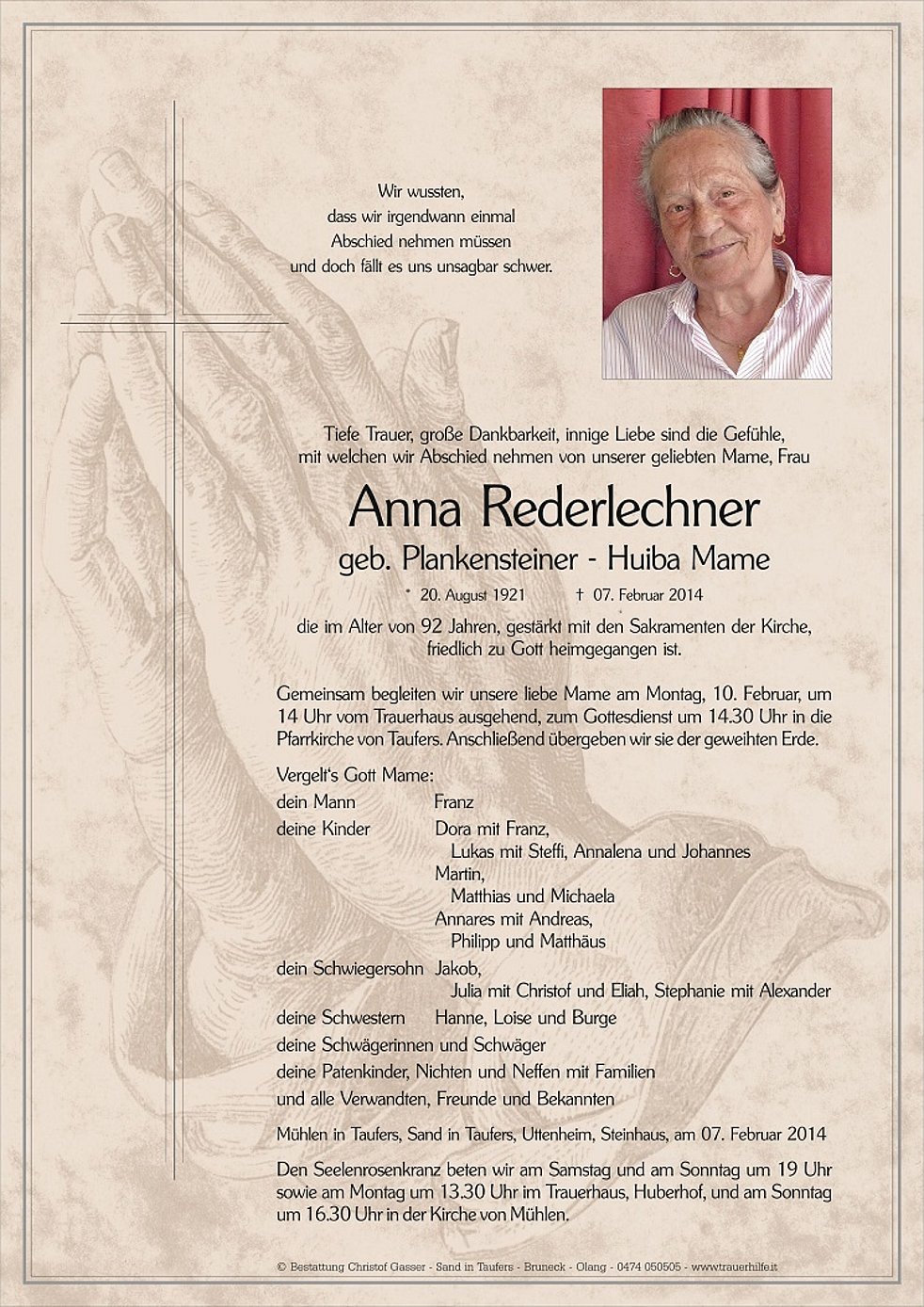 Gemeinsam begleiten wir unsere liebe Mame am Montag, 10. Februar, um 14 Uhr vom Trauerhaus ausgehend, zum Gottesdienst um 14.30 Uhr in die Pfarrkirche von Taufers. Anschließend übergeben wir sie der geweihten Erde.