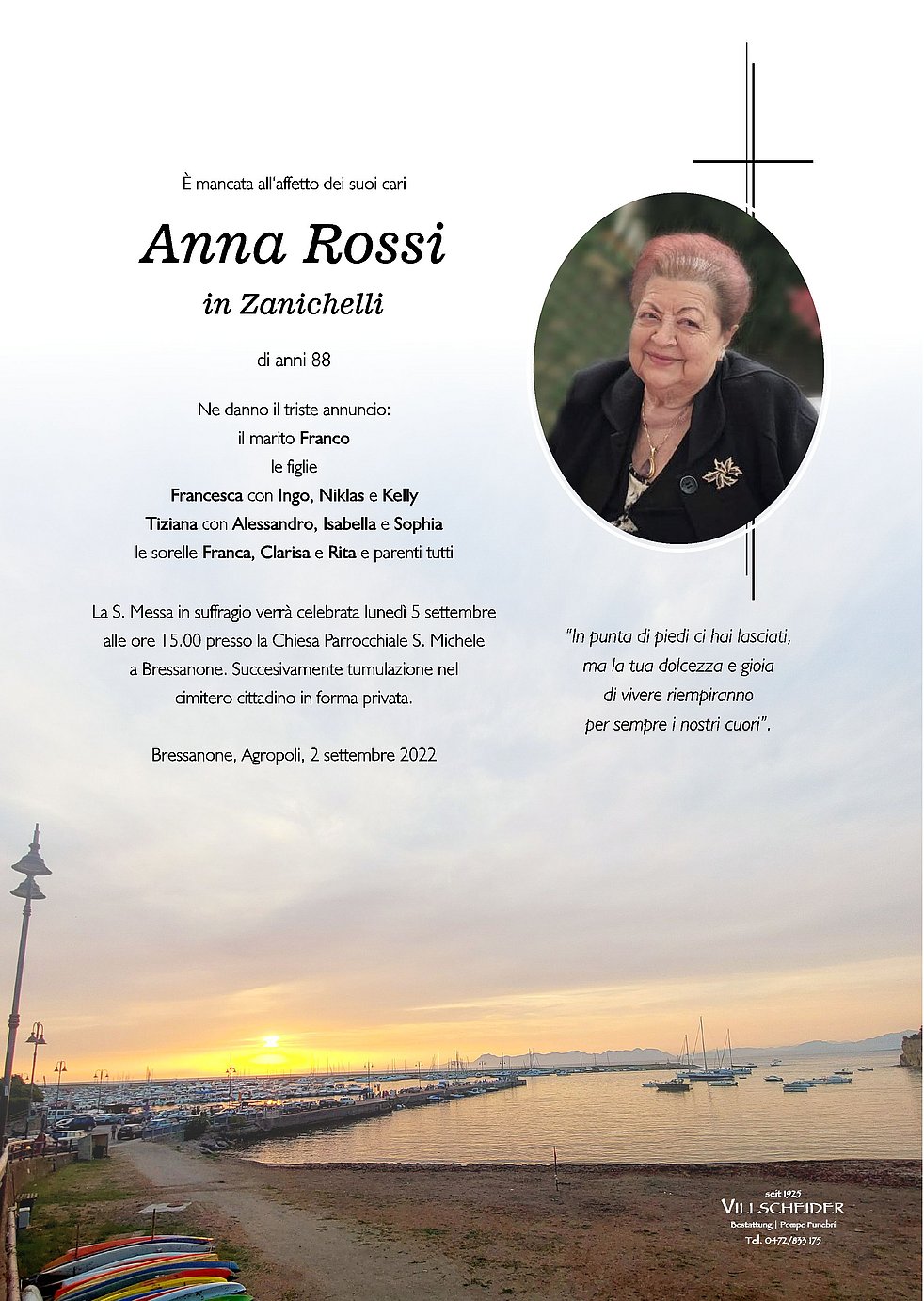 Carissimo Franco, le mie piu' sentite condoglianze a Te e famiglia per la scomparsa della Signora Anna, che terro' sempre nei miei ricordi come persona molto gentile e cordiale, in particolar modo le tante piacevoli chiacchierate. Thomas Deiaco e famiglia - Val Badia.