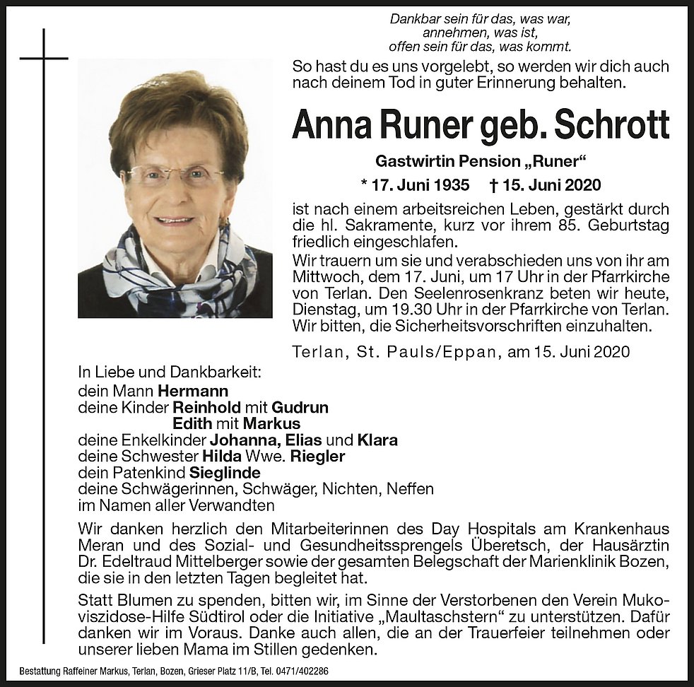 Anstatt Blumen zu spenden, bitten wir im Sinne der Verstorbenen, den Verein Mukoviszidose-Hilfe Südtirol oder die Initiative „Maultaschstern“ zu unterstützen. Dafür danken wir im Voraus. Danke auch allen, die an der Trauerfeier teilnehmen oder unserer lieben Mama im Stillen gedenken.
