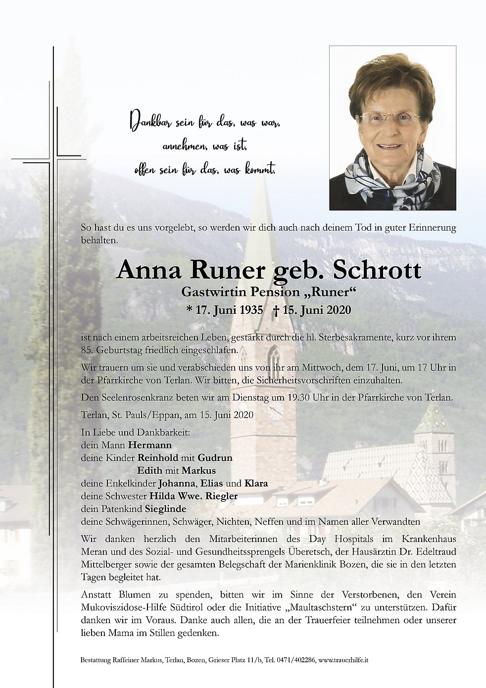 Wir trauern um sie und verabschieden uns von ihr am Mittwoch, dem 17. Juni, um 17 Uhr in der Pfarrkirche von Terlan.