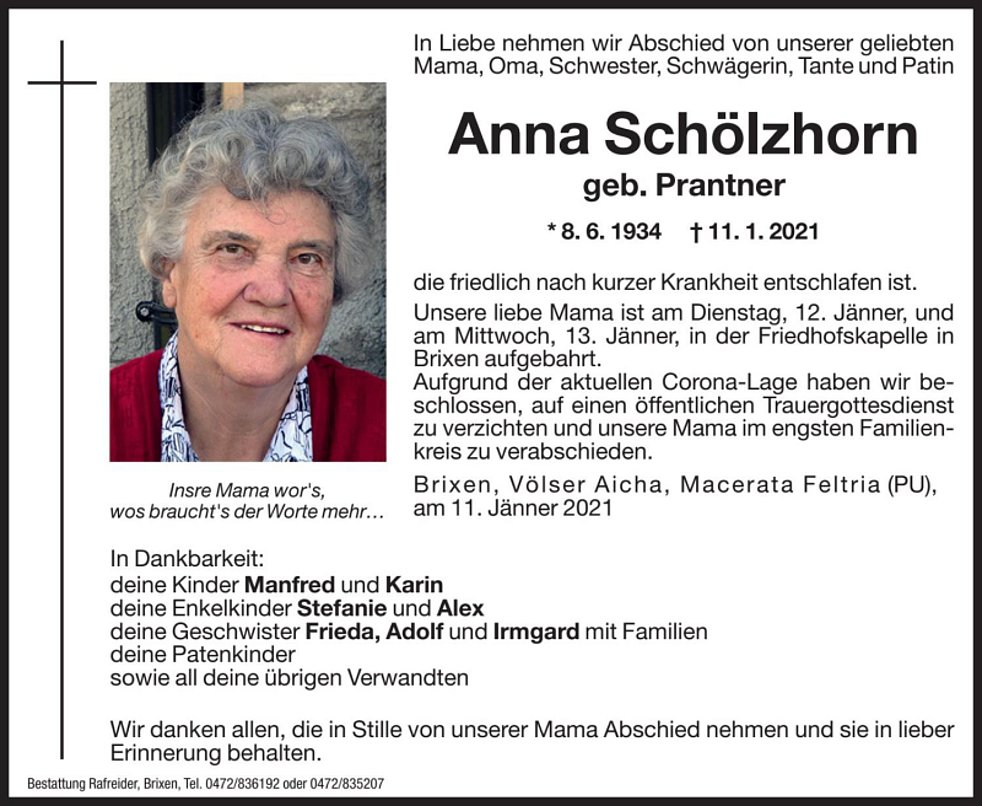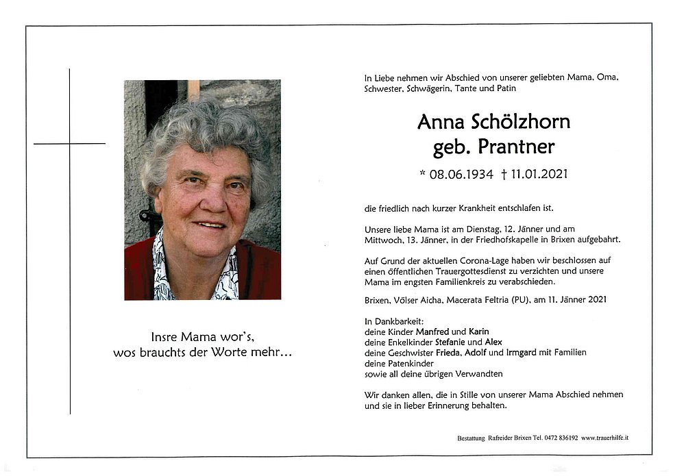 Unsere liebe Mama ist am Dienstag, 12. Jänner und am Mittwoch, 13. Jänner, in der Friedhofskapelle in Brixen aufgebahrt.