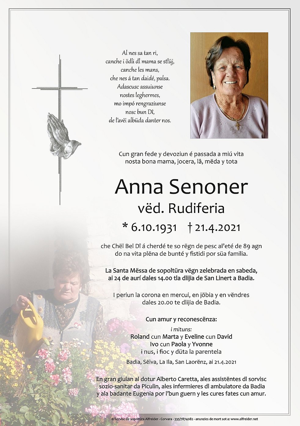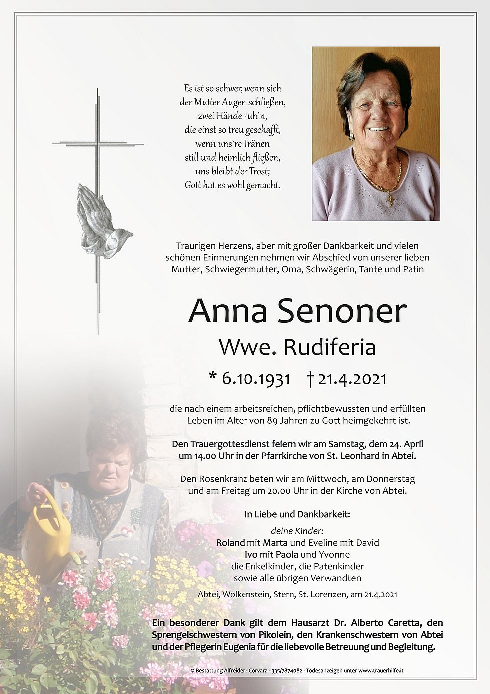 Ein besonderer Dank gilt dem Hausarzt Dr. Alberto Caretta, den Sprengelschwestern von Pikolein, den Krankenschwestern von Abtei und der Pflegerin Eugenia für die liebevolle Betreuung und Begleitung.