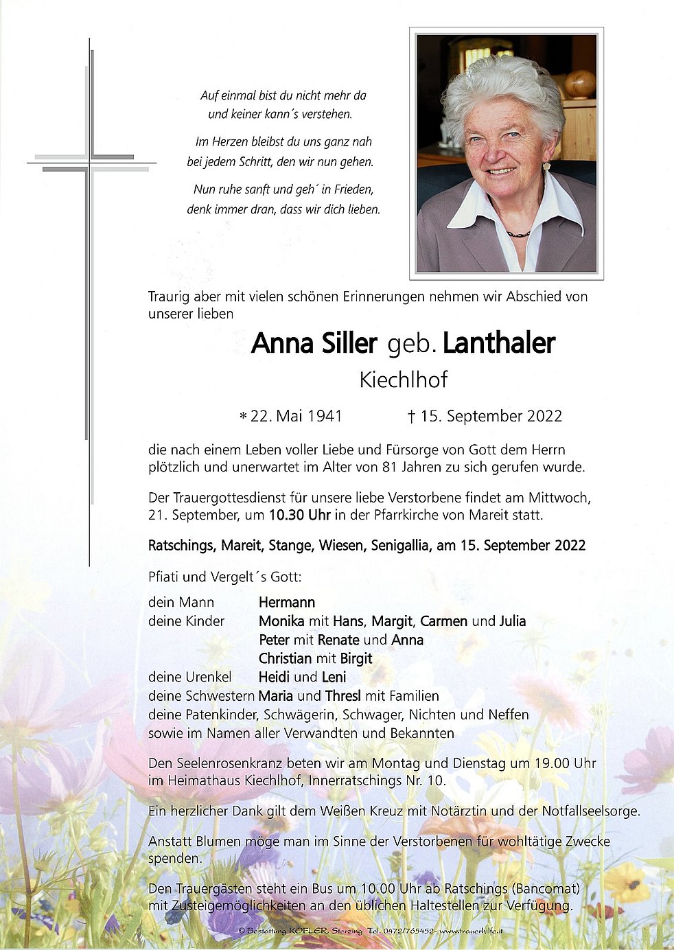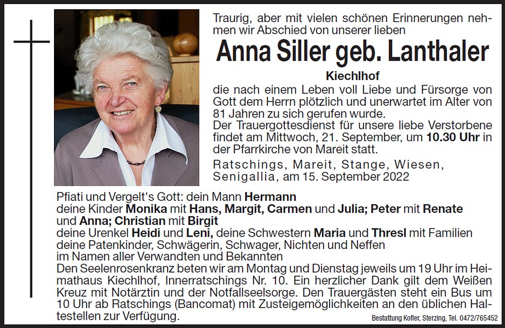 Der Trauergottesdienst für unsere liebe Verstorbene findet am Mittwoch, 21. September, um 10.30 Uhr in der Pfarrkirche von Mareit statt.