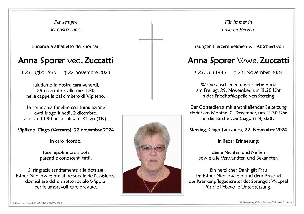 Wir verabschieden unsere liebe Anna am Freitag, 29. November, um 11.30 Uhr in der Friedhofskapelle von Sterzing.