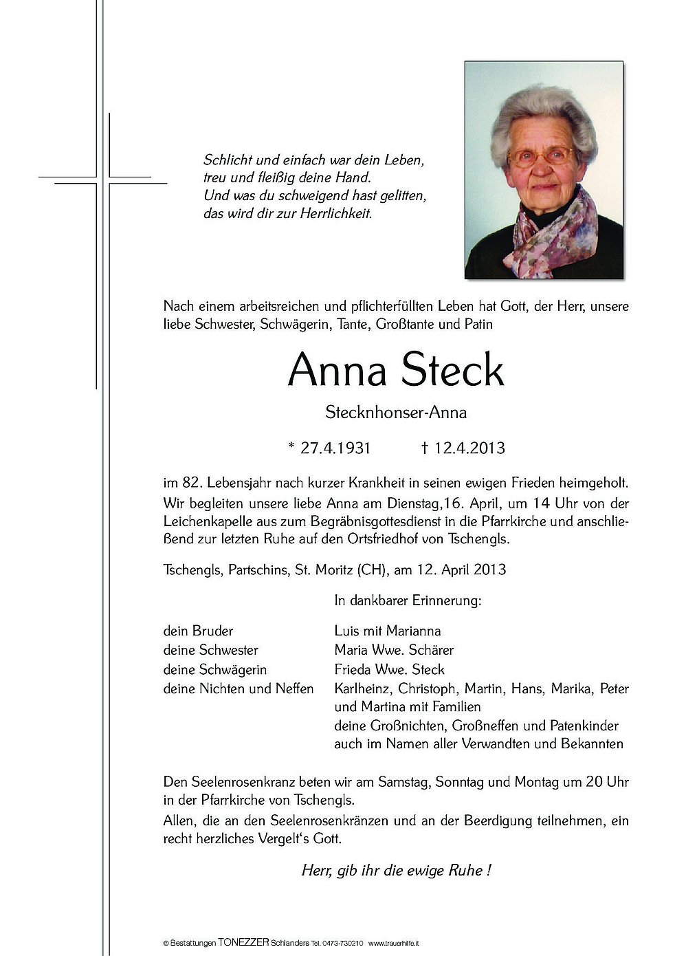 Wir begleiten unsere liebe Anna am Dienstag,16. April, um 14 Uhr von der Leichenkapelle aus zum Begräbnisgottesdienst in die Pfarrkirche und anschließend zur letzten Ruhe auf den Ortsfriedhof von Tschengls.
