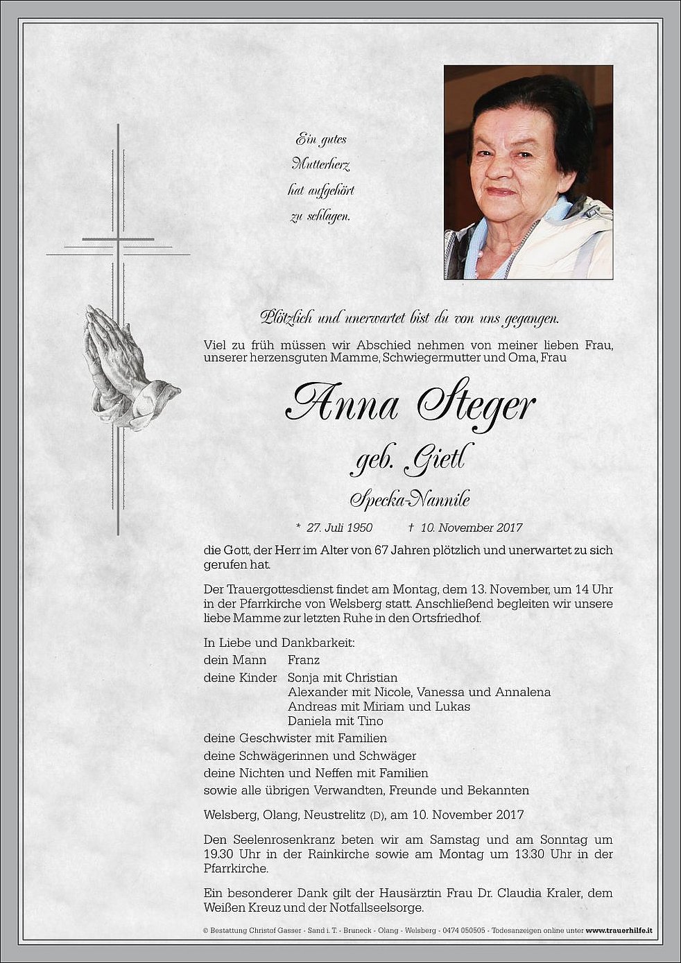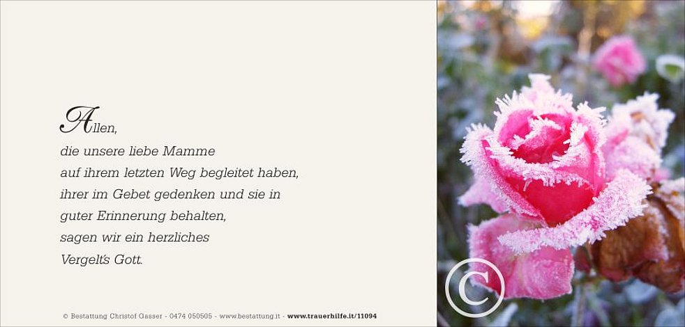 Der Trauergottesdienst findet am Montag, dem 13. November, um 14 Uhr in der Pfarrkirche von Welsberg statt. Anschließend begleiten wir unsere liebe Mamme zur letzten Ruhe in den Ortsfriedhof.