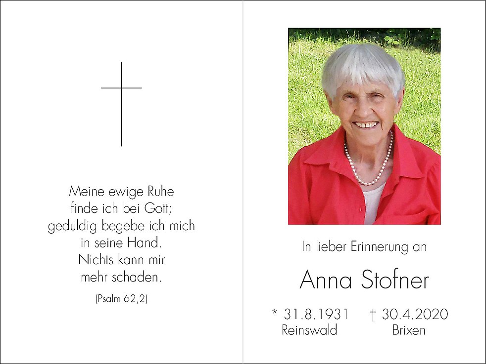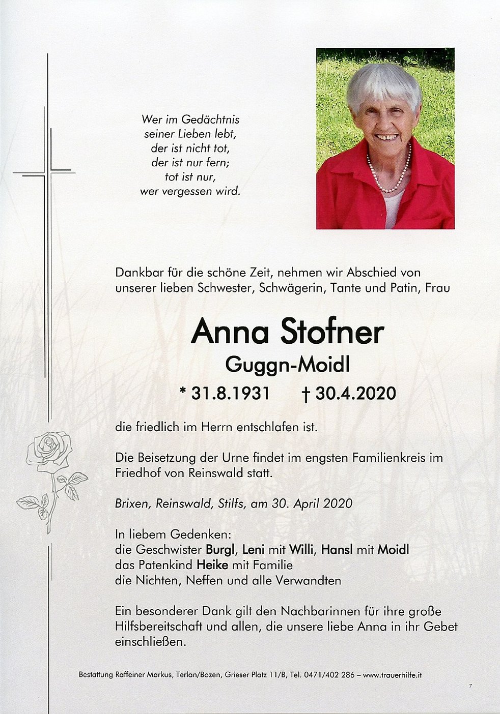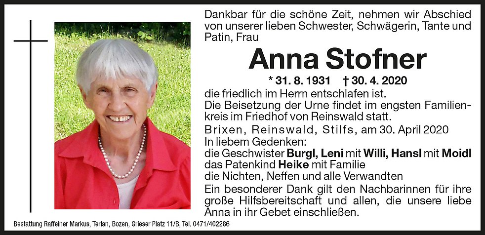Ein besonderer Dank gilt den Nachbarinnen für ihre große Hilfsbereitschaft und allen, die unsere liebe Anna in ihr Gebet einschließen.