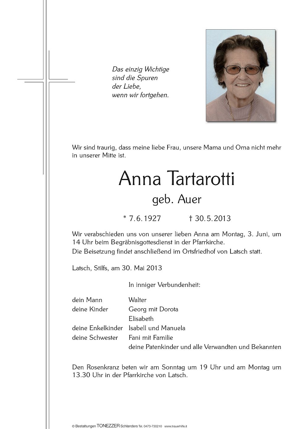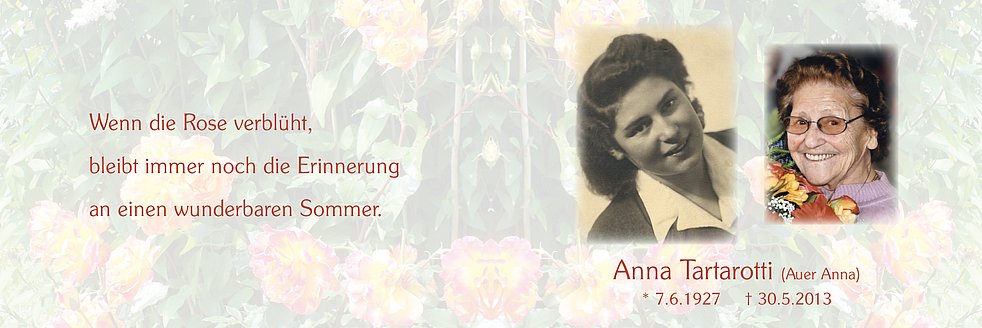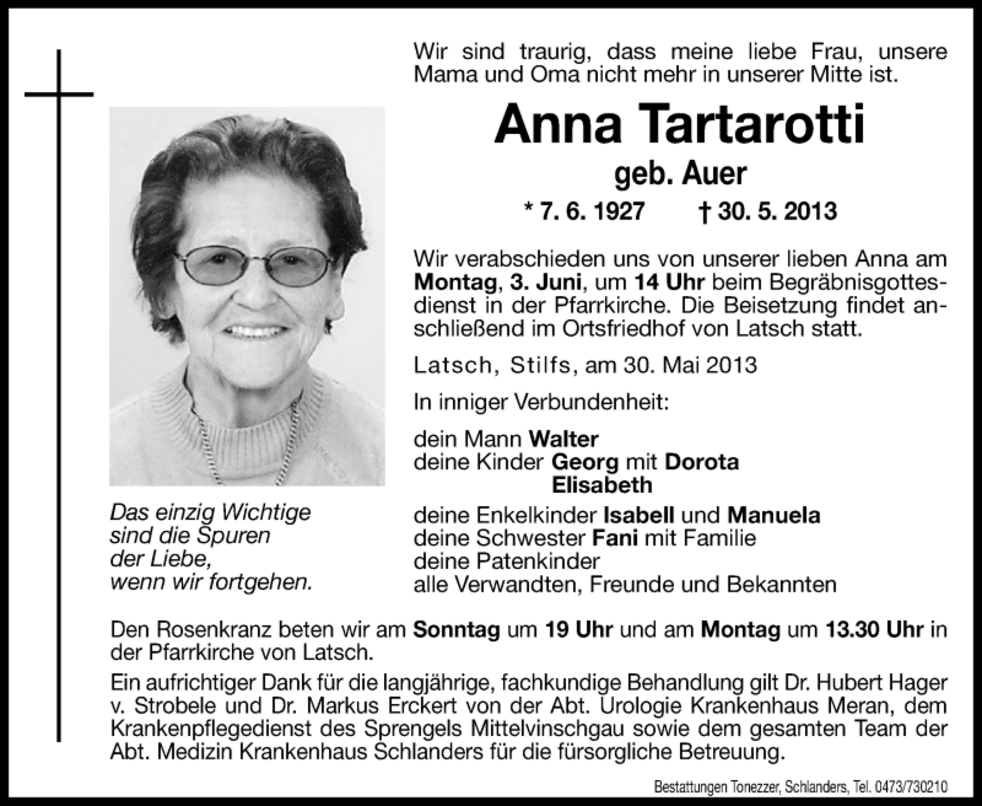 Wir verabschieden uns von unserer lieben Anna am Montag, 3. Juni, um 14 Uhr beim Begräbnisgottesdienst in der Pfarrkirche. Die Beisetzung findet anschließend im Ortsfriedhof von Latsch statt.