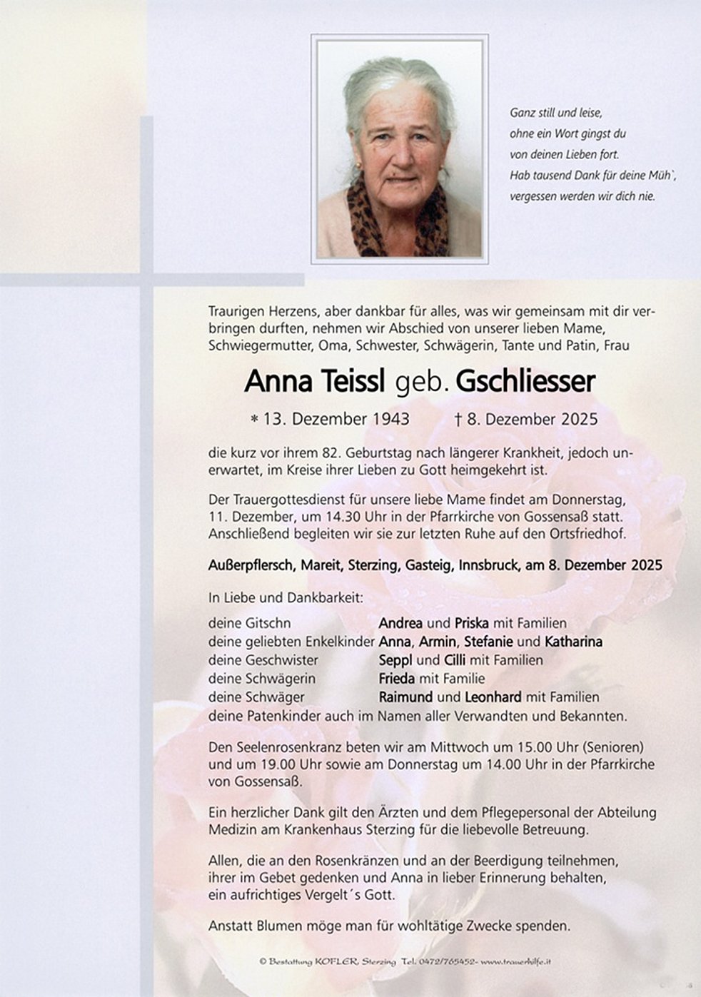 Der Trauergottesdienst für unsere liebe Mame findet am Donnerstag, 11. Dezember, um 14.30 Uhr in der Pfarrkirche von Gossensaß statt. Anschließend begleiten wir sie zur letzten Ruhe auf den Ortsfriedhof.