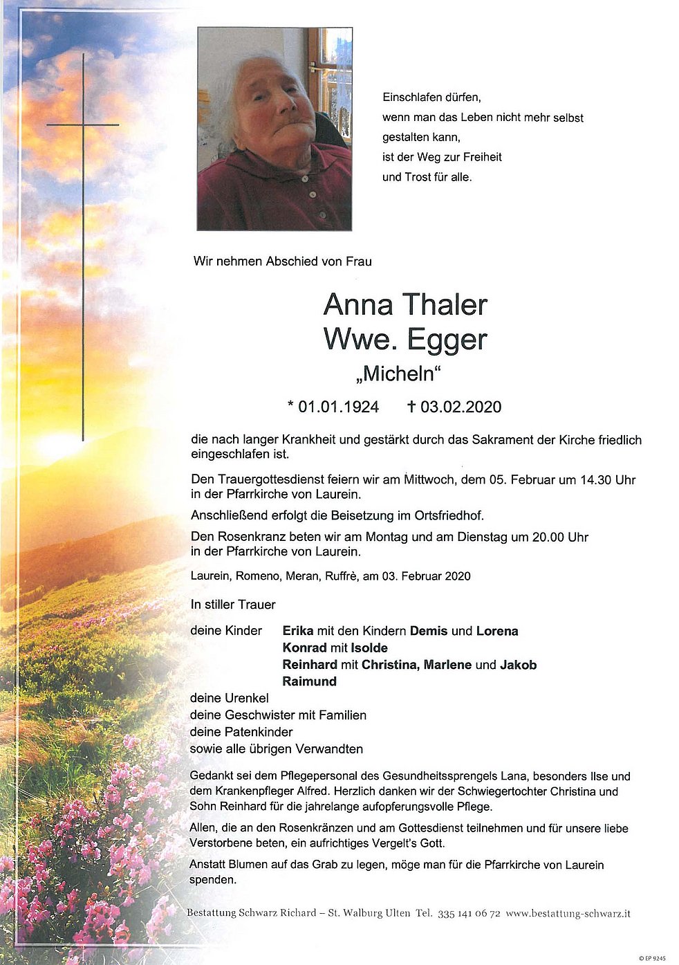 Begräbnisgottesdienst: 05.02. - 14:30 Uhr Pfarrkirche Laurein