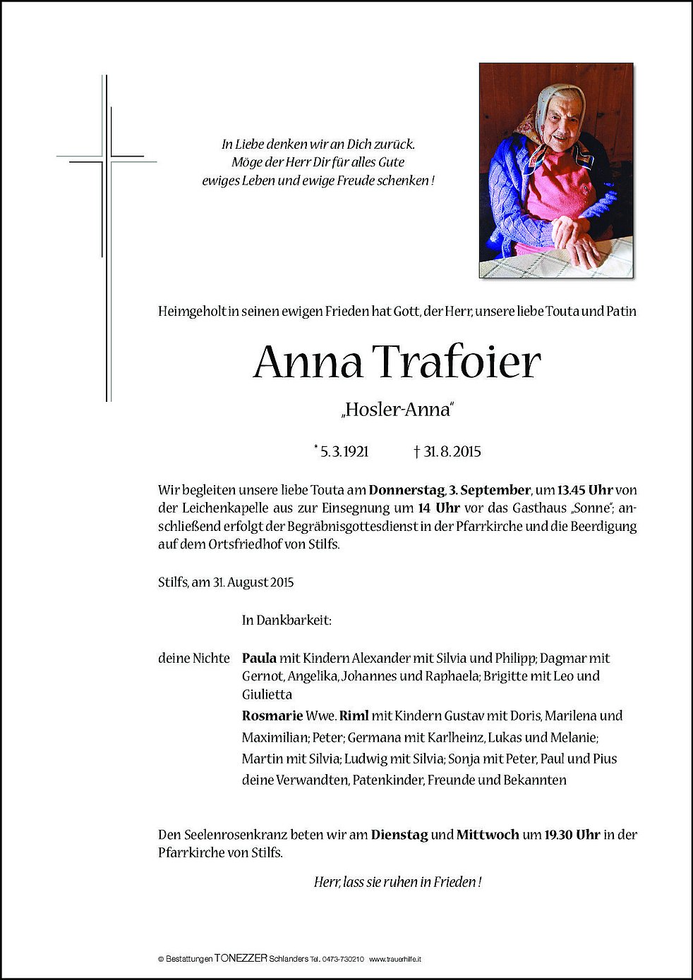 Wir begleiten unsere liebe Touta am Donnerstag, 3. September, um 13.45 Uhr von der Leichenkapelle aus zur Einsegnung um 14 Uhr vor das Gasthaus „Sonne“; anschließend erfolgt der Begräbnisgottesdienst in der Pfarrkirche und die Beerdigung auf dem Ortsfriedhof von Stilfs.