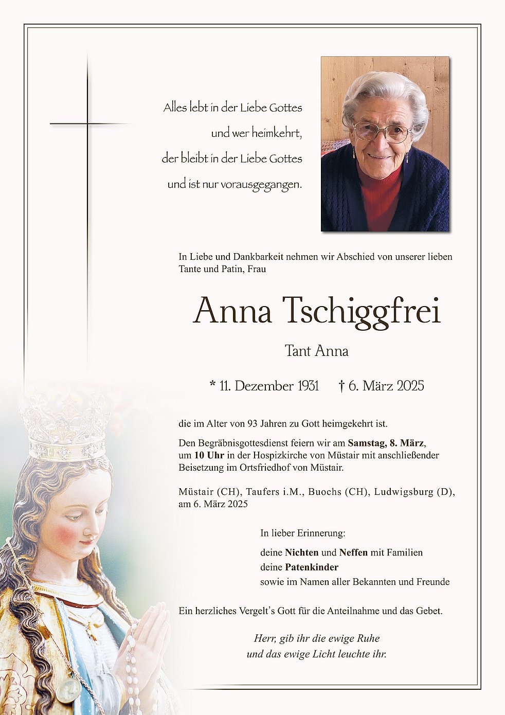 Begräbnisgottesdienst: 08.03. - 10:00 Uhr Hospizkirche Müstair (CH)
