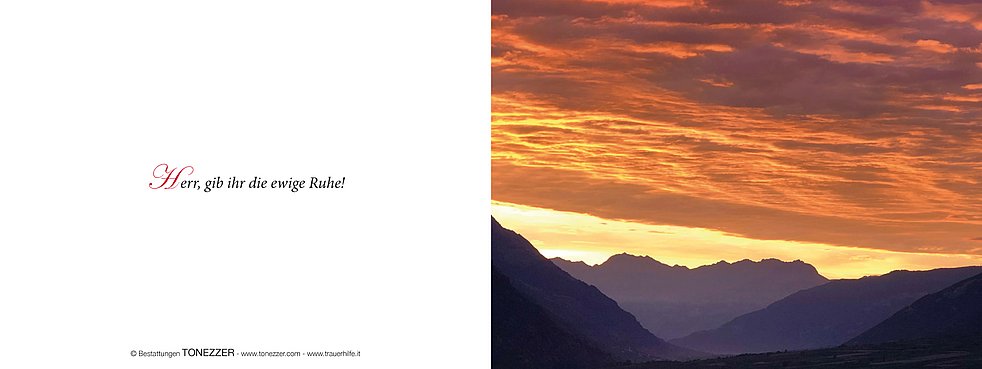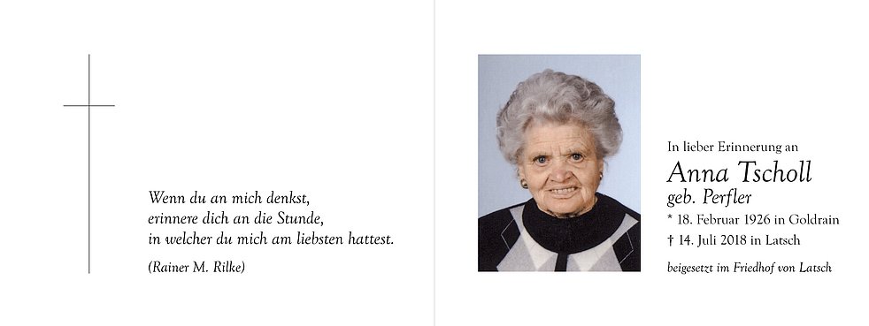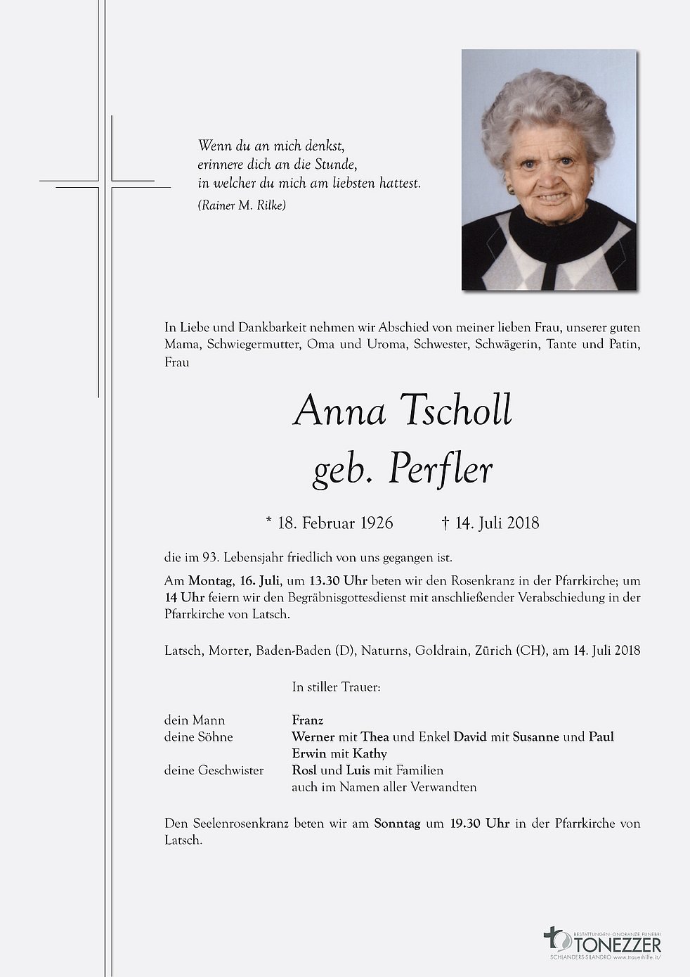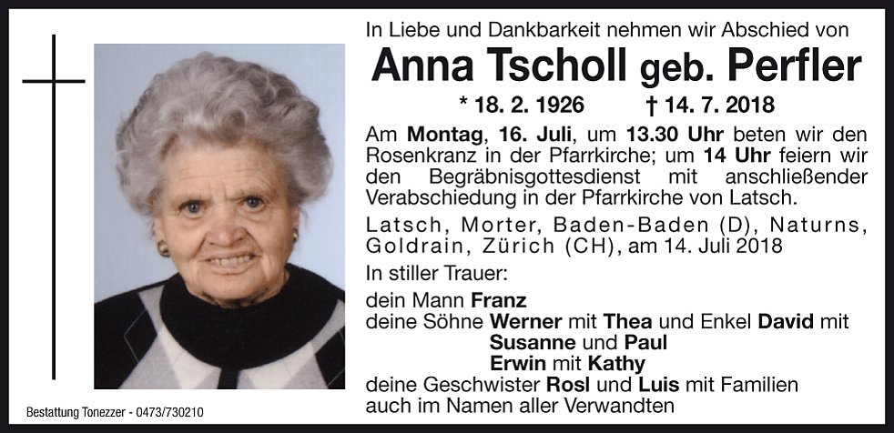 Am Montag, 16. Juli, um 13.30 Uhr beten wir den Rosenkranz in der Pfarrkirche; um 14 Uhr feiern wir den Begräbnisgottesdienst mit anschließender Verabschiedung in der Pfarrkirche von Latsch.
