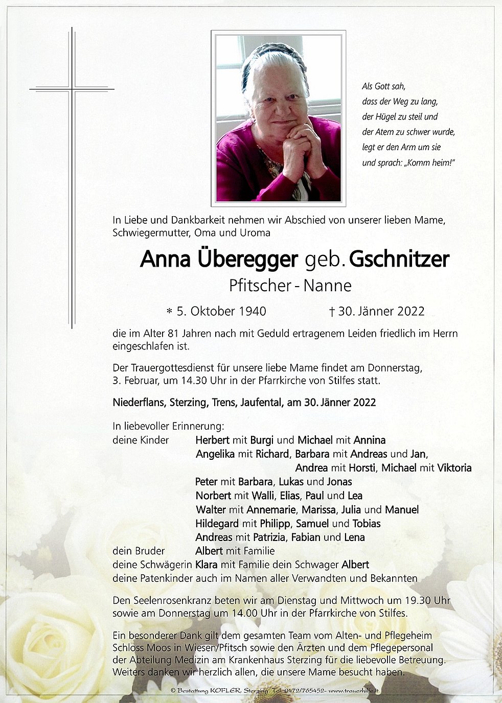 Der Trauergottesdienst für unsere liebe Mame findet am Donnerstag, 3. Februar, um 14.30 Uhr in der Pfarrkirche von Stilfes statt.