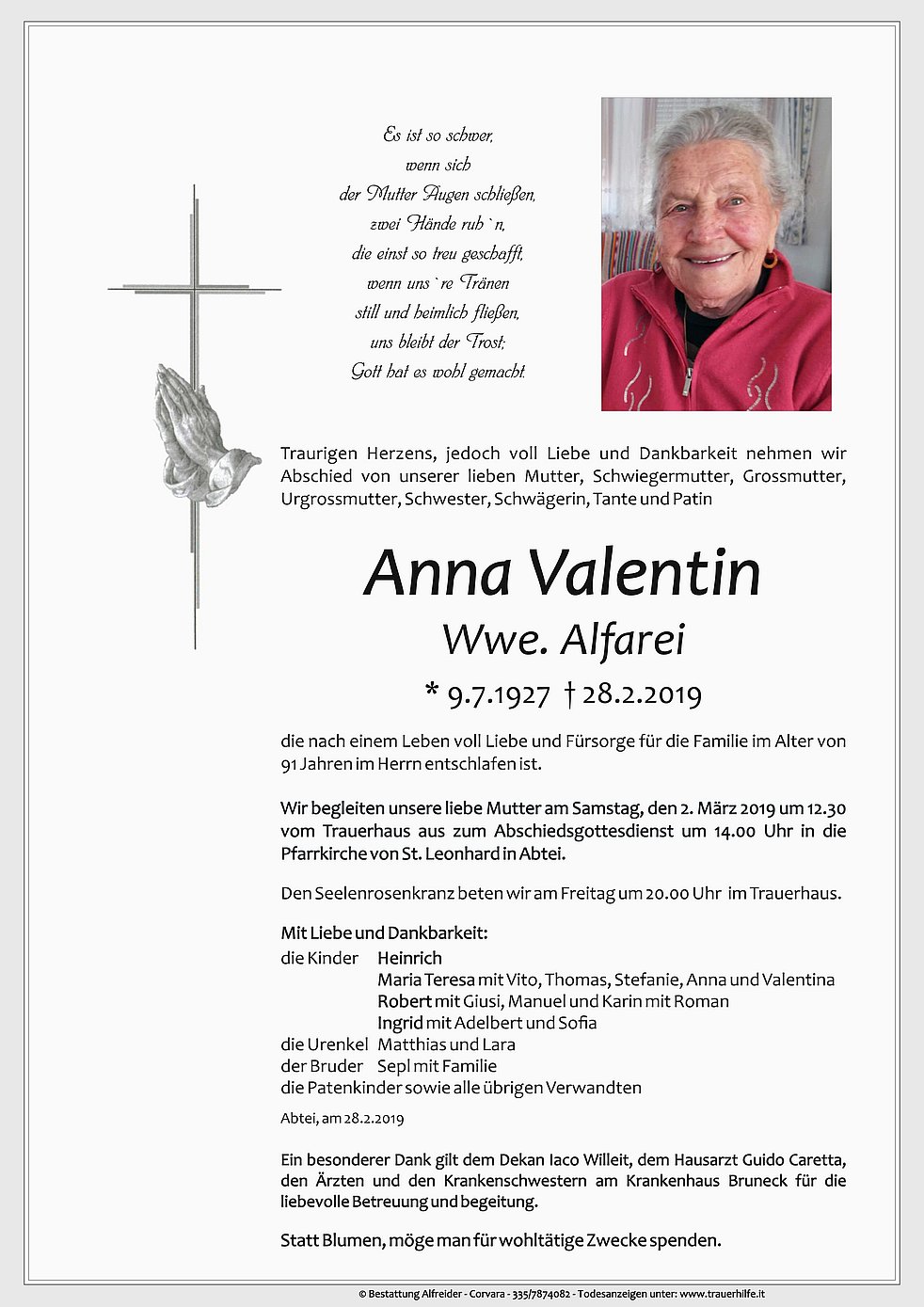 Wir begleiten unsere liebe Mutter am Samstag, den 2. März 2019 um 12.30 vom Trauerhaus aus zum Abschiedsgottesdienst um 14.00 Uhr in die Pfarrkirche von St. Leonhard in Abtei.